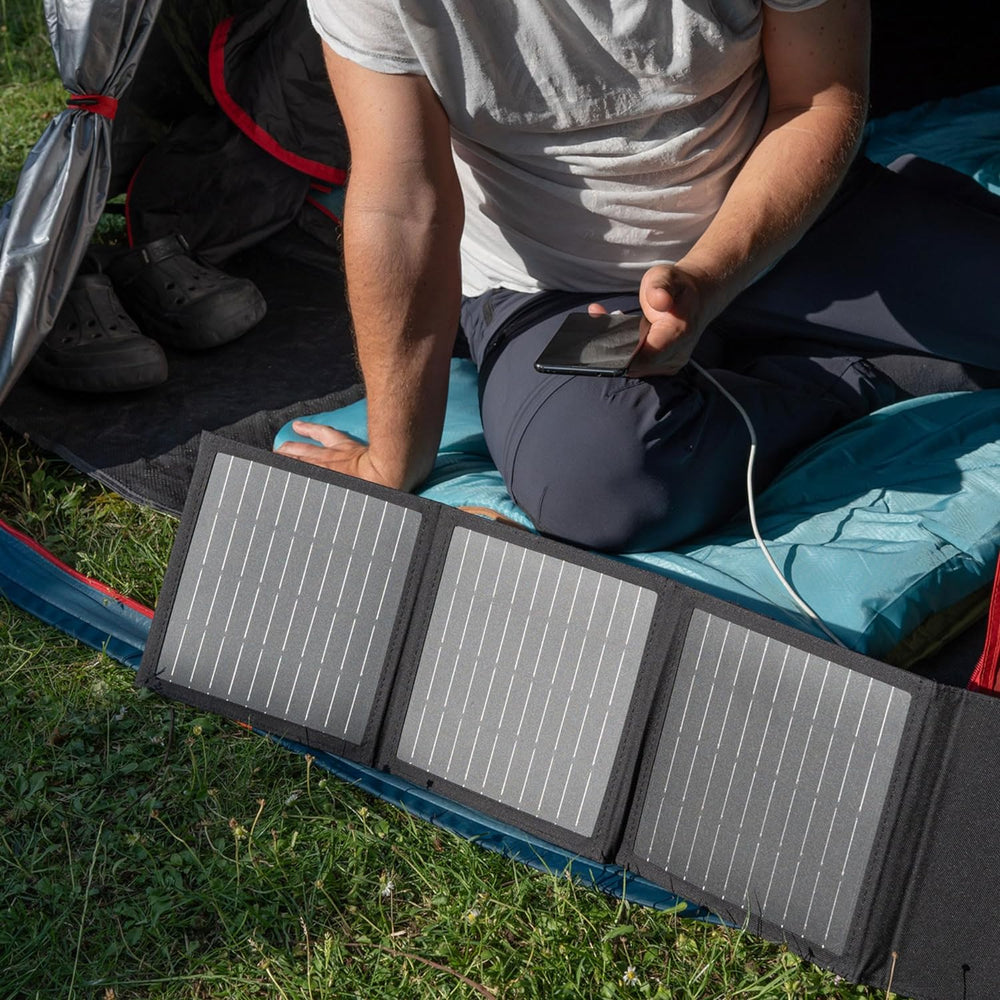 - 🔋 Faltbares Solar Panel mit 3 effizienten Solarzellen 21W und integrierter Powerbank