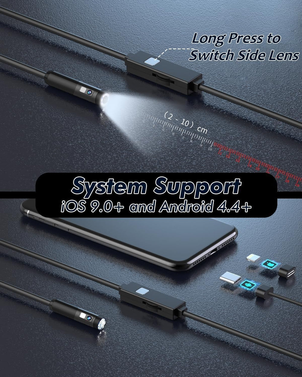 - Doppellinsen Endoskopkamera:Drahtloses 1080P-Endoskop mit zwei Linsen, die Linse auf der Vorderseite kann unterschiedliche Brennweiten erhalten und ist mit 8+1 LED-Leuchten ausgestattet, um die Visualisierung von Blockaden oder Objekten zu erleichtern.