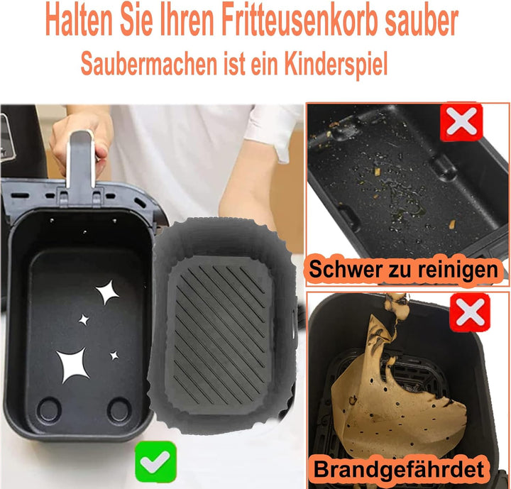 - [Wiederverwendbare Airfryer Silikonform]: Hergestellt aus 100% lebensmittelechtem Silikon, nicht klebend, ungiftig, BPA-frei, geruchsneutral, hitzebeständig bis 230℃, brennt nicht an, sicherer und umweltfreundlicher als Luftfritteusen-Papiereinlagen.
