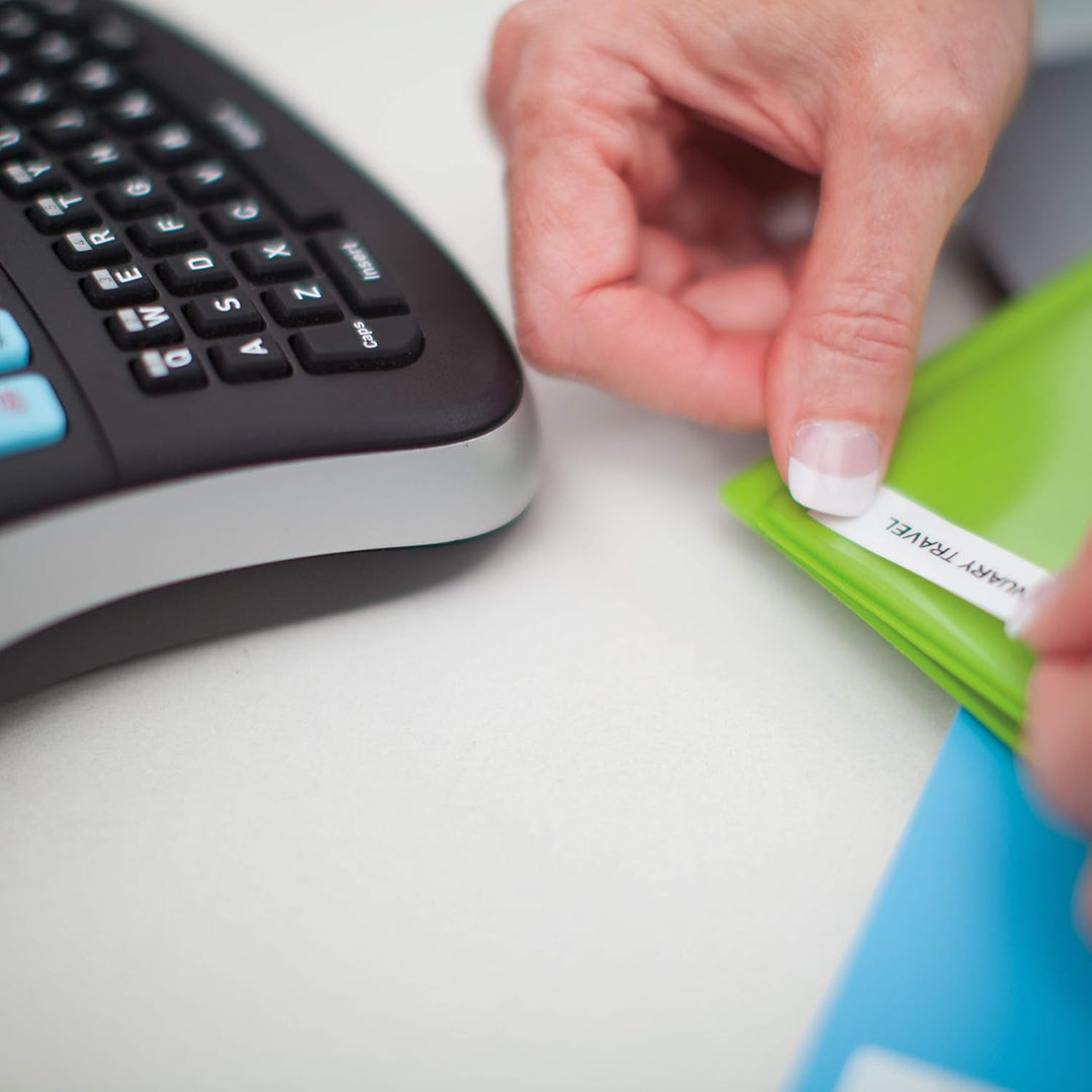 - Nutzt DYMO D1-Etiketten mit einer Breite von 6, 9 und 12 mm; Drucken Sie 1 oder 2 Zeilen pro Etikett (auf 9 oder 12 mm breiten Etiketten)