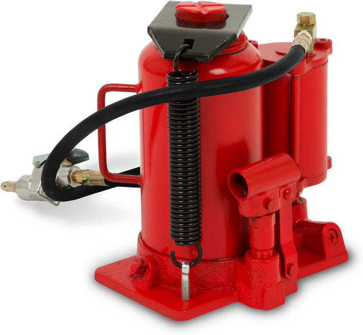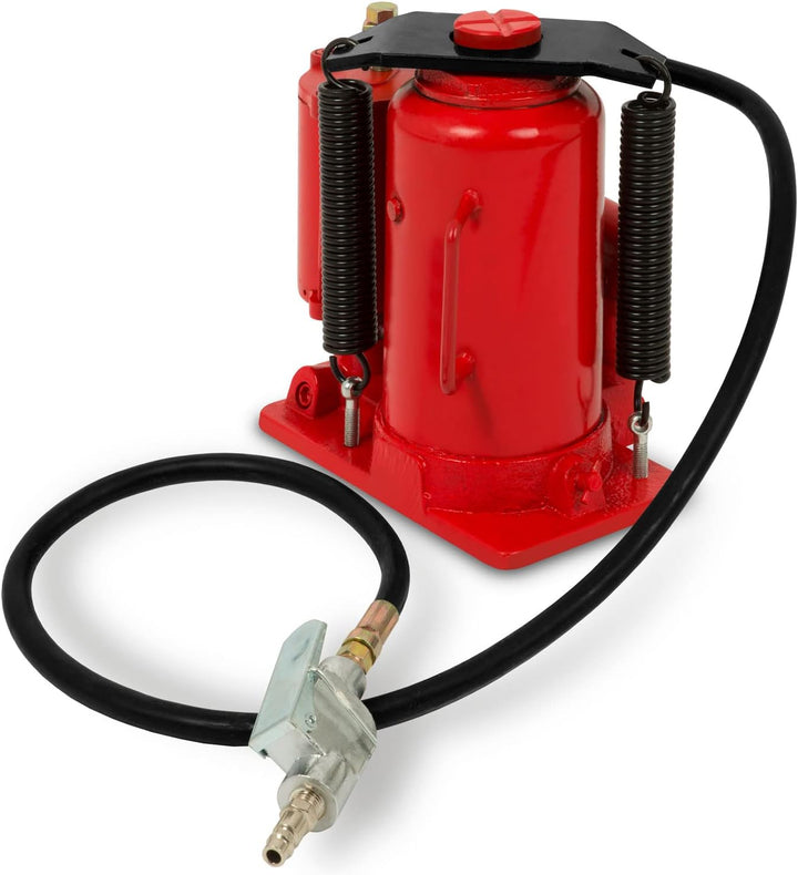 • Der Wagenheber kann wahlweise manuell oder pneumatisch betrieben werden, er ist mindestens 265 und maximal 510 mm hoch, die Hubhöhe beträgt 245 mm. Für den manuellen Betrieb ist ein faltbarer Pumphebel inklusive. Der Druckluftanschluss ist 1/4" und