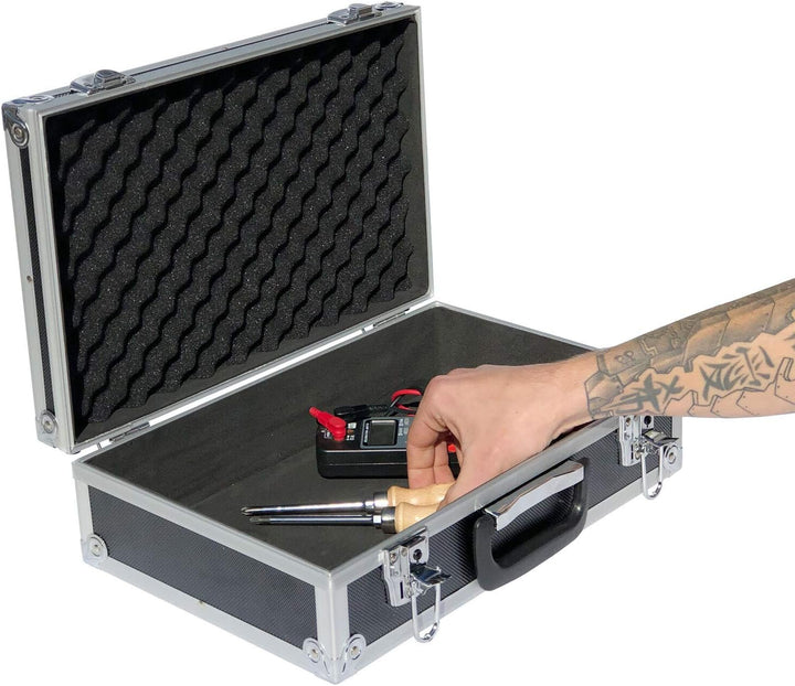 - Handlicher Alukoffer mit Würfelschaum in der Farbe Schwarz mit kompakten Abmessungen: Aussenmass (LxBxH) 400x250x115 mm & Innenmass (LxBxH) 390 x 240 x 105 mm leer.