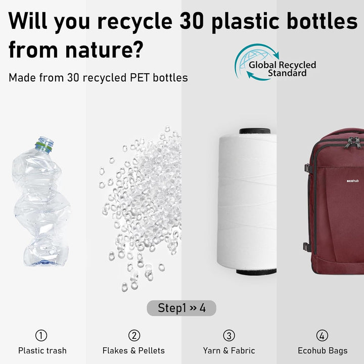 - 【RECYCELTES PET-HOCHWERTIGES GEWEBE】: Der ECOHUB reiserucksack ist zu 100% umweltfreundlich, da er aus 30 Plastik-PET-Flaschen hergestellt wird! Das recycelte Gewebe ist wasserabweisend und leicht und von GRS zertifiziert. Auch ausgestattet mit