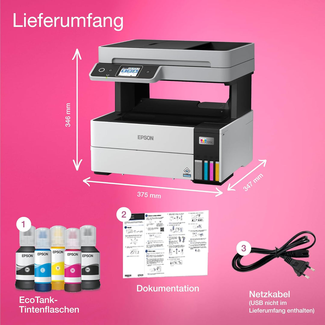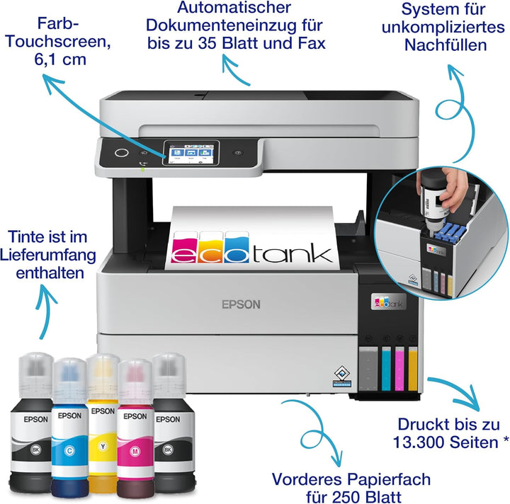 - DIN A4 EcoTank-Drucker mit vielen Funktionen - Drucken, kopieren und scannen Sie mit dem EcoTank ET-5170, der Faxen, beidseitigen Druck, ein vorderes Papierfach für 250 Blatt und einen automatischen Dokumenteneinzug für 35 Blatt bietet. Sämtliche