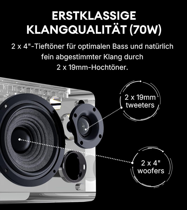 - KRAFTVOLL - 70W RMS Ausgangsleistung für knackigen Sound. Bässe und Höhen am Gerät einstellbar. Frontseitige Bassreflexöffnung