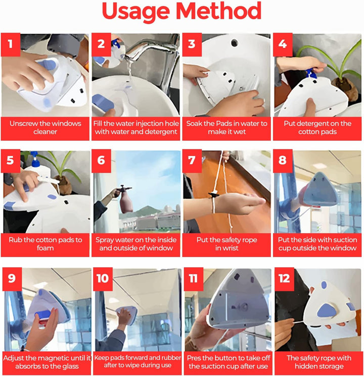 - EINFACHE ANWENDUNG: Befestigen Sie zunächst das Sicherheitsseil an dem Teil des Reinigers, der sich auf der Aussenseite der Scheibe befindet, füllen Sie ihn mit Wasser, um den Schwamm anzufeuchten, geben Sie ein wenig Fensterreiniger oder Seife auf den