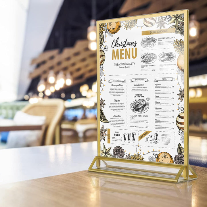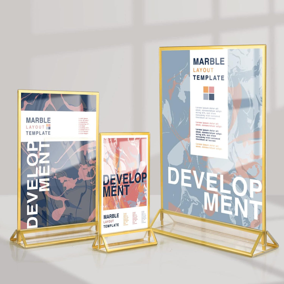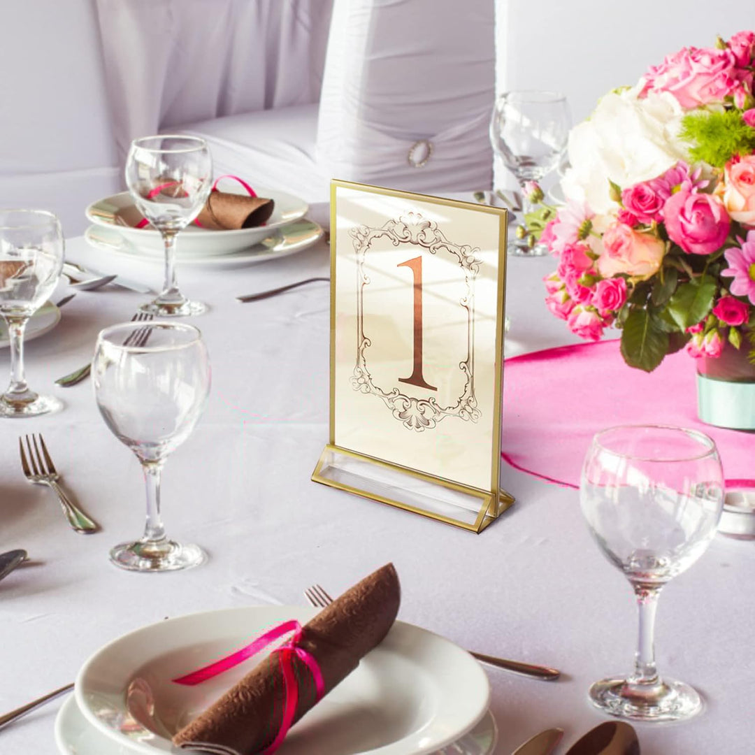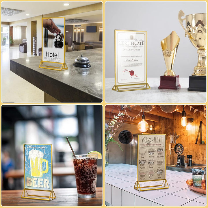 • 🖼️【Zwei-Seiten-Anzeige】: Mit diesem Tischaufsteller können Sie leicht mehr Informationen zeigen. Die Acrylplatte mit Goldrand ist hübsch, leicht und praktisch, steht im 90-Grad-Winkel und hat eine solide dreieckige Basis.