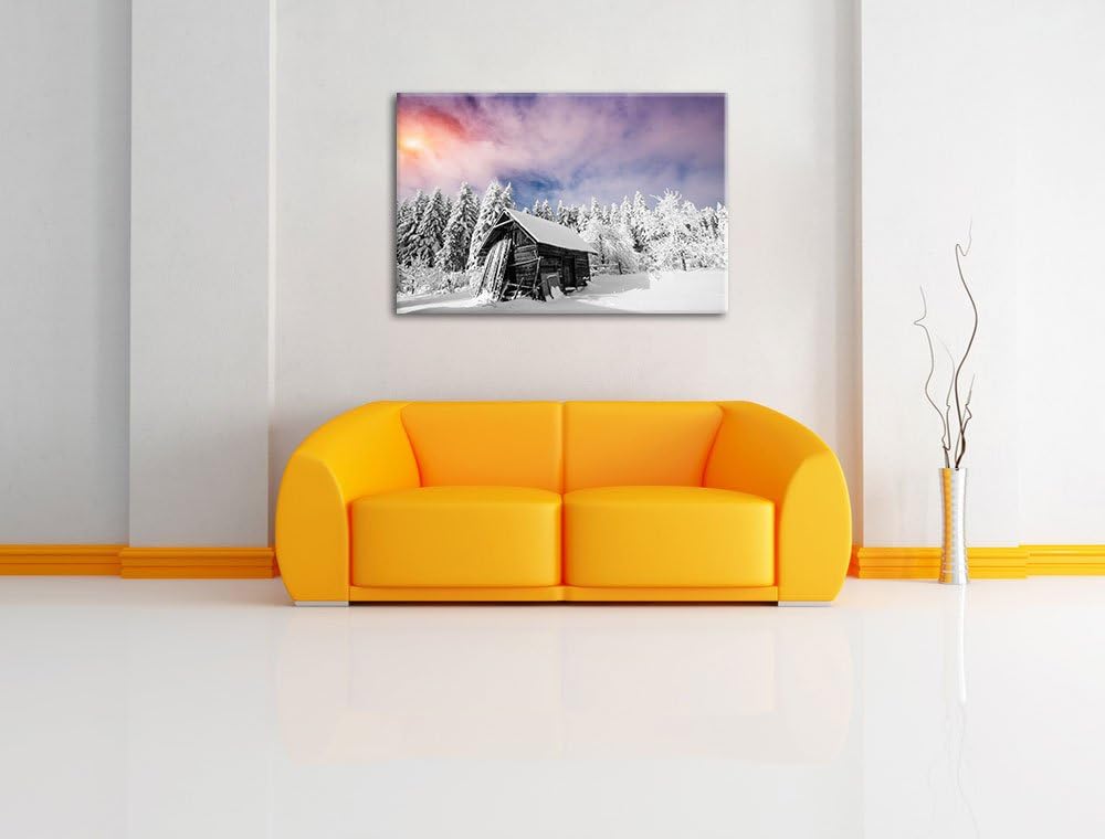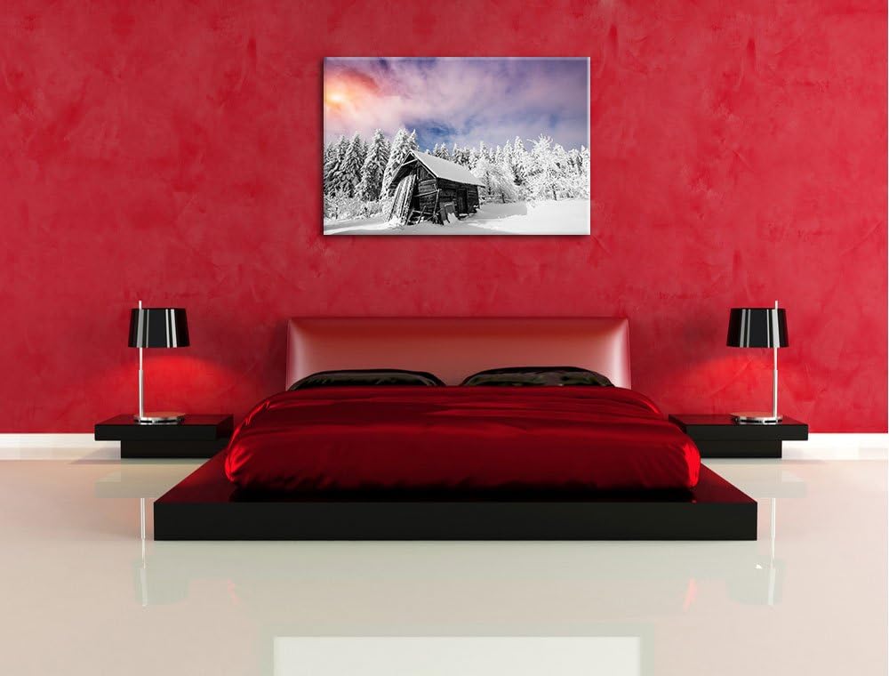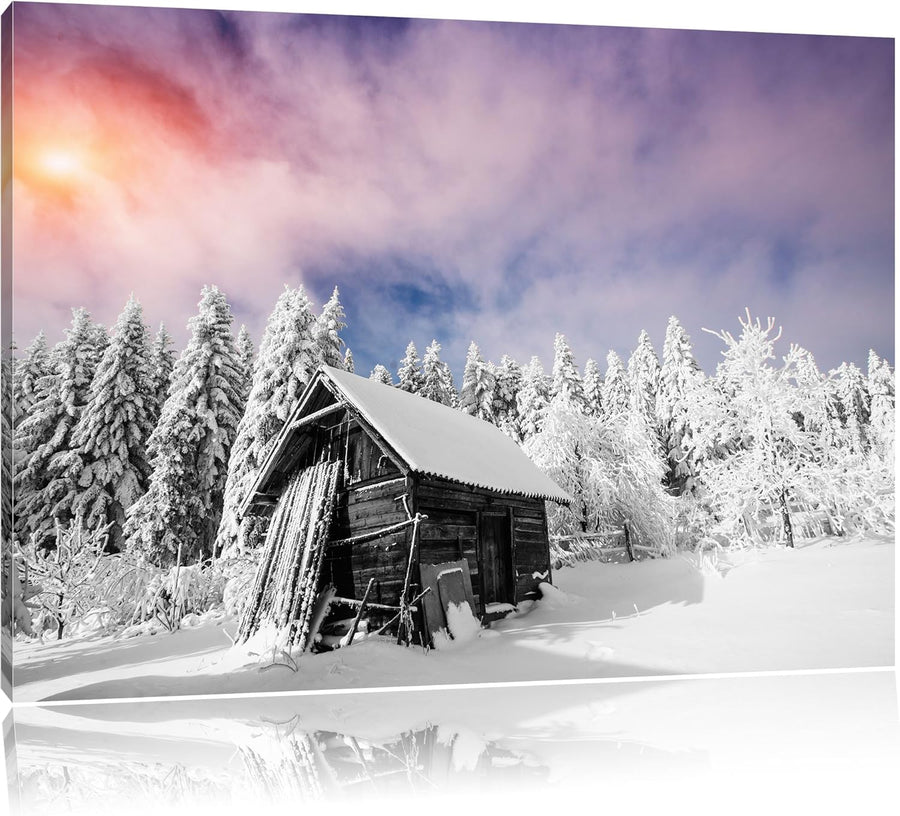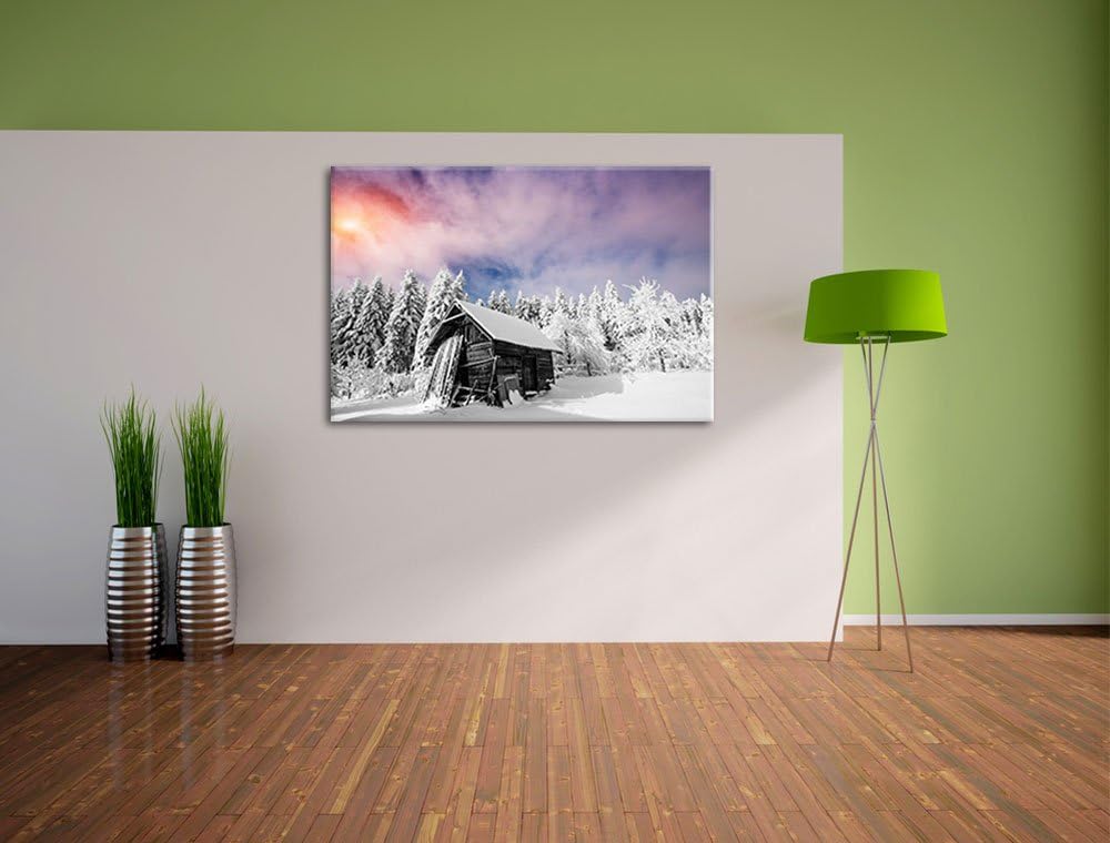 Einsame gemütliche Holzhütte im Schnee schwarz/weiss Format: 100x70 auf Leinwand, XXL riesige Bilder