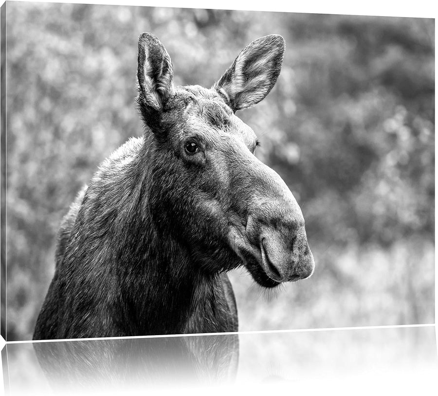 Elch im Wald Kunst B&W, Format: 100x70 auf Leinwand, XXL riesige Bilder fertig gerahmt mit Keilrahme