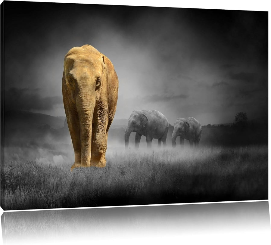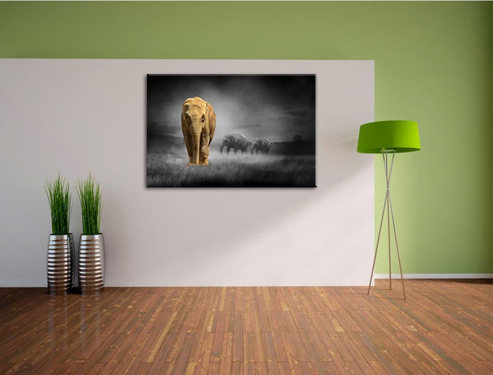 Elefanten in Steppe schwarz/weiss Format: 100x70 auf Leinwand, XXL riesige Bilder fertig gerahmt mit