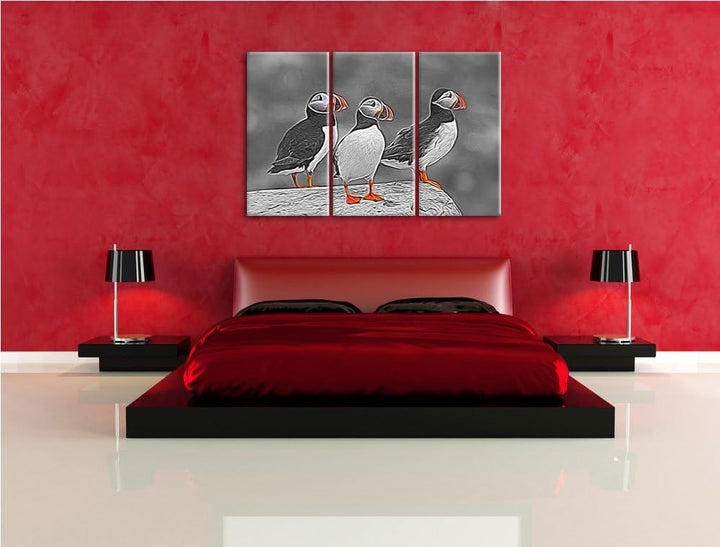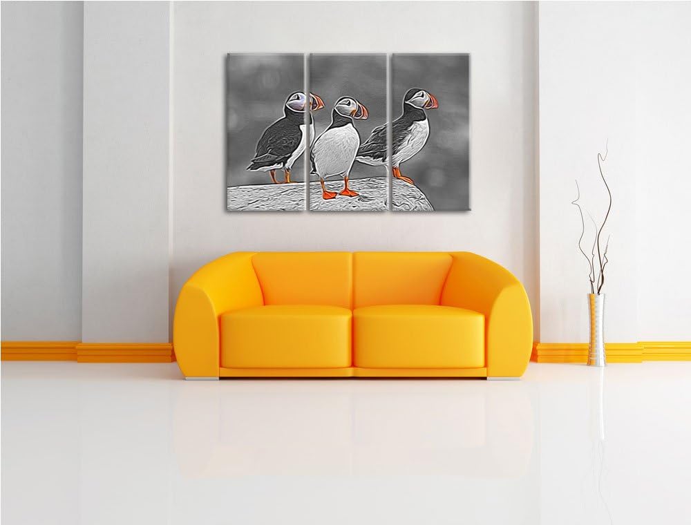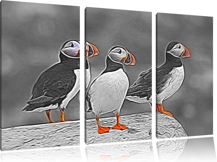 elegante Papageitaucher auf Felsen schwarz/weiss Spezial 3-Teiler Leinwandbild 120x80 Bild auf Leinw