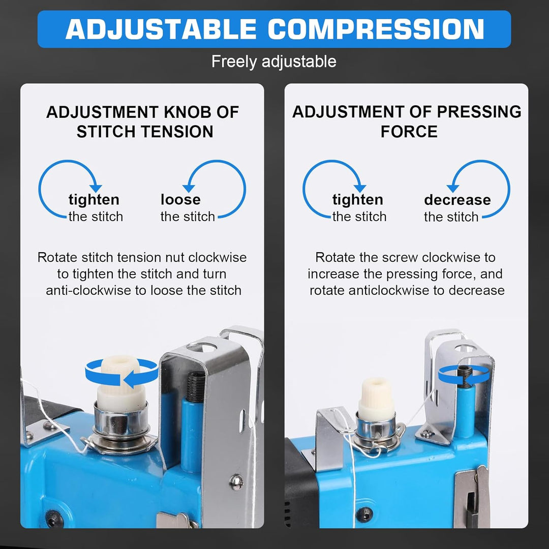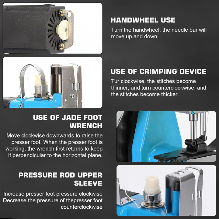 - Automatisches Fadenschneiden: Diese tragbare Sacknähmaschine verfügt über eine automatische Fadenschneidefunktion, sodass Sie keinen Schere benötigen, um den Faden abzuschneiden. Die Nähmaschine verwendet eine professionelle Fadenverriegelung, um