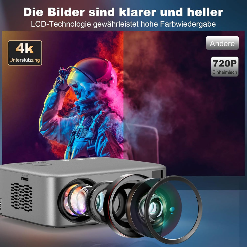 - 【Native 1080P & Support 4K】Für ein besseres Seherlebnis wurde der FRESHDE Projektor mit einer Bildschirmauflösung von 1920*1080 neu aufgerüstet. Native 1080P und Unterstützung von 4K-Auflösung ermöglichen Ihnen ein Seherlebnis auf Kino-Niveau.