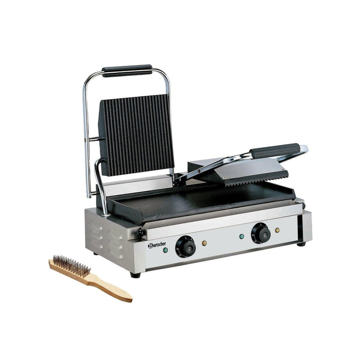- Gerät aus robustem Chrom-Nickel-Stahl , grosse Grillfläche und oben gerillte, unten glatte Grillplatte