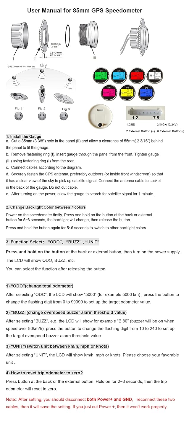 - Trip und Kilometerzähler, Geschwindigkeit: 0–999 (MPH, Knoten, km/h einstellbar), Kilometerstand: 0–99999 (Mi, NMI, KM verfügbar)