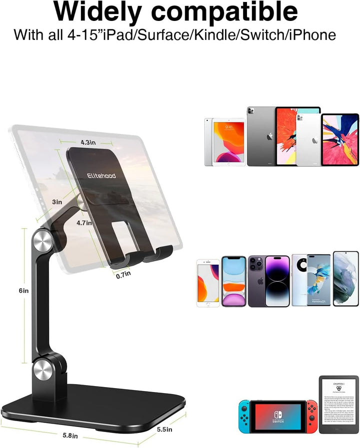 - 【Höhe iPad Ständer】: Anstelle eines einzigen oder zwei Drehpunkte hat der Elitehood iPad Halterung Tisch ein DRITTES Gelenk. Daher kann es Ihr Tablet für Ihr Zoom-Meeting, Lesen und Ansehen auf eine höhere Ebene (19cm von der Unterseite des