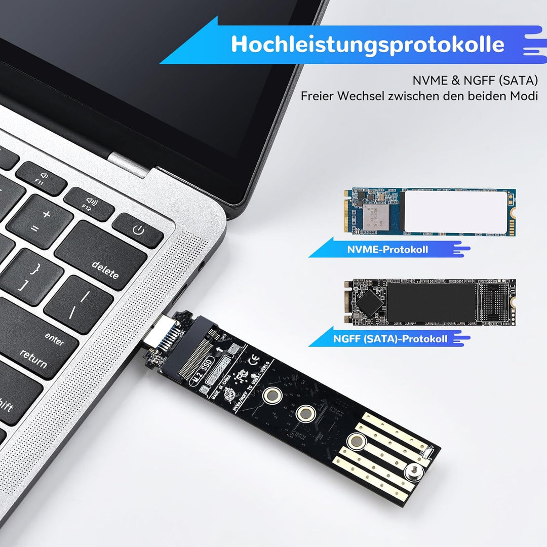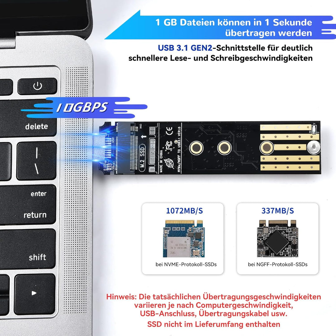 - 【Hohe Geschwindigkeit & Stabilität】Der externe Ausgangsanschluss ist USB3.1 GEN2 USB Typ-A. Die theoretische Übertragungsgeschwindigkeit beträgt 10 Gbit/s für das NVME-Protokoll und 5 Gbit/s für das NGFF-Protokoll, mit einer erheblichen