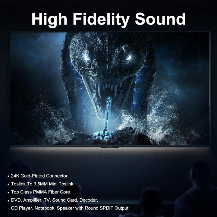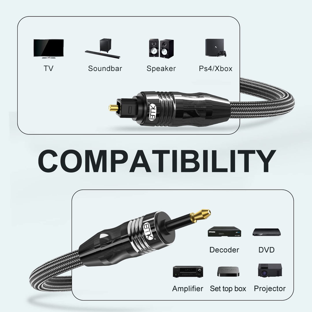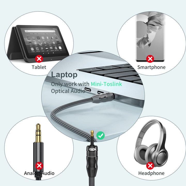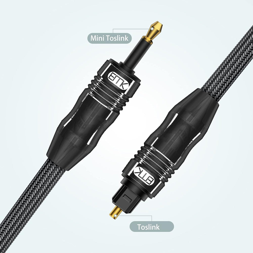 - Die optischen 3,5-mm-Mini-Toslink-Kabel sind für bestimmte Geräte wie iMacs, Fernseher und Notebooks mit einem integrierten 3,5-mm-Anschluss gefertigt.