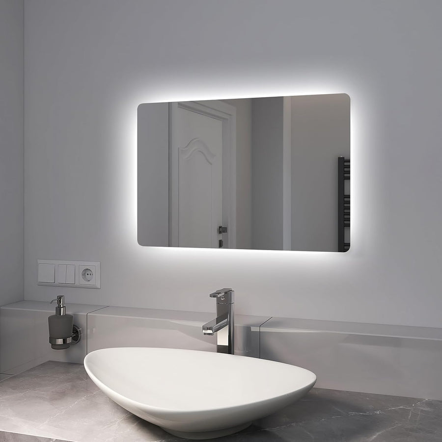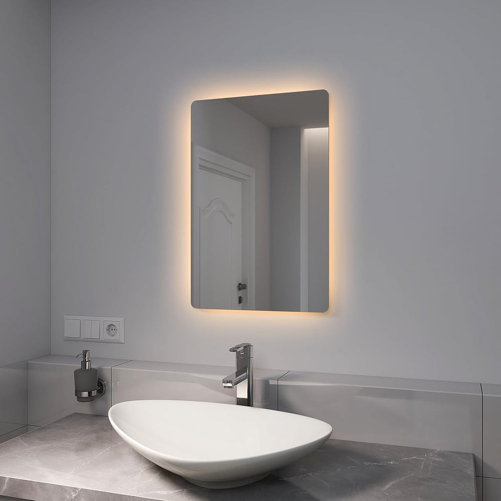 - 【LED Badspiegel】Hinterleuchtet Spiegel 40x60/60x40cm, kann horizontal oder vertikal aufgehängt werden. Mit Knopfschalter, 2 Lichtfarben Warmweiss/Kaltweiss, separater Anti-Beschlag-Taste, energiesparend und IP44 wasserdicht.