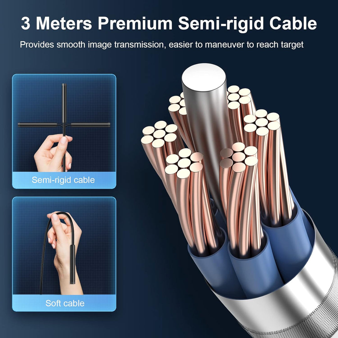 - HALTBARES UND FLEXIBLES LANGES KABEL. Die Kanalkamera verfügt über ein 3 Meter langes, halbstarres Schlangenkabel, das sich biegen lässt und seine Form beibehält, um an eine Vielzahl von beengten Stellen zu gelangen. Brennweite von 2-10cm für das
