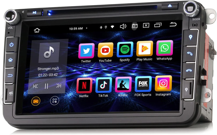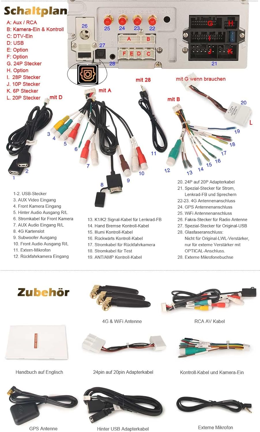 - ✔ Radio-Tuner mit RDS, 30 voreingestellten Radiosendern (FM: 3*6, AM: 2*6). Unterstützt iPhone/iPad Audio Input, Charge und Touch Control. Sie können den iPod Audio Decoder ES150 kaufen, damit es funktioniert. Unterstützt Auto-DVR-Eingang, Touch Control und Stromversorgung. Unterstützt DAB + / Digital TV Box / Rückfahrkamera-Eingang. Unterstützung Lenkradsteuerung, Handbremssteuerung.