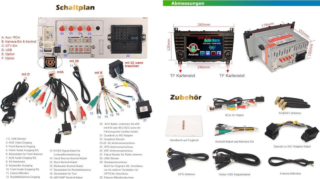 - đăLeistungsstĂ€rkere Funktionenă Integriertes Android Multimedia Player, es kann Musik/Video/Foto aus interne Speicher oder externe USB-Stick abspielen. Eingebauter DVD, CD, USB, TF, Radio, RDS, Uhr. UnterstĂŒtzt DAB+, DVB-T2, TPMS, OBD2, DVR,