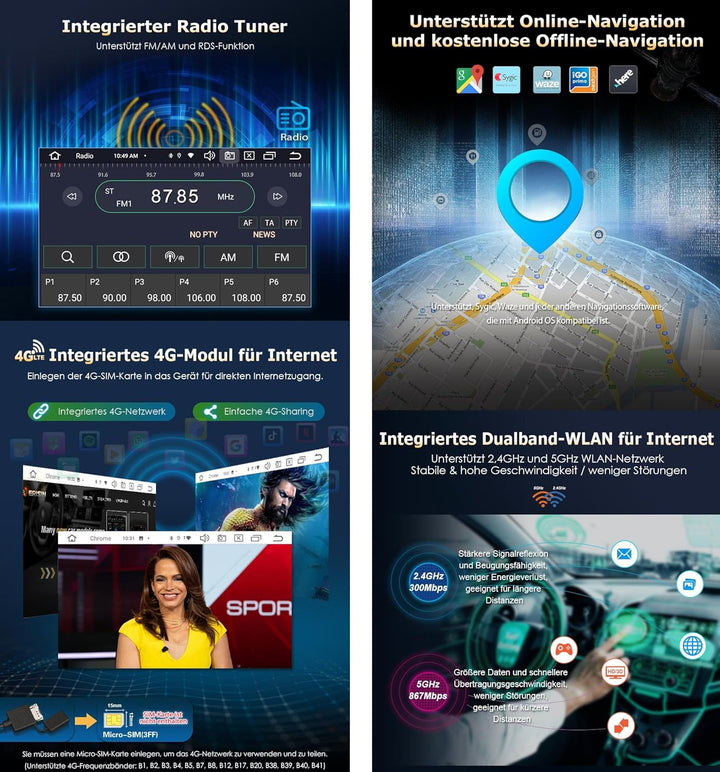 • 🚗【Dualband-WLAN + 4G-Modul + Lenkradsteuerung】 Integriertes Dualband-WLAN fĂŒr das Internet, unterstĂŒtzt 2,4-GHz- und 5-GHz-WLAN-Netzwerke, mit denen Sie schneller im Internet surfen können. Eingebautes 4G-Modul, unterstĂŒtzt Micro-SIM-Karte.