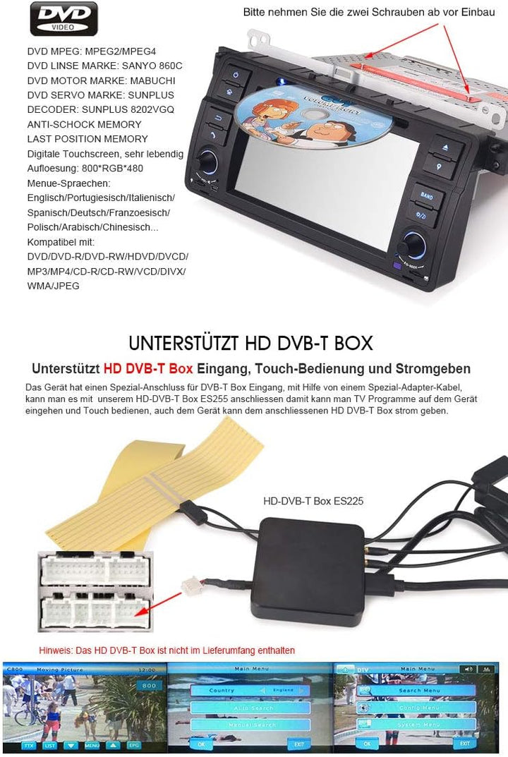 - Das Auto Multimedia System passt zu:BMW 3 Series E46 1998~2001 mit Alt 17-Pin Verbinder,BMW 3 Series E46 2002~2006 mit Neu 40-Pin Verbinder,BMW M3 1998~2006 und BMW E46 3er 318 320 325,Rover 75 1999~2004 und MG ZT 2001~2004. Die Grösse der Frontblende