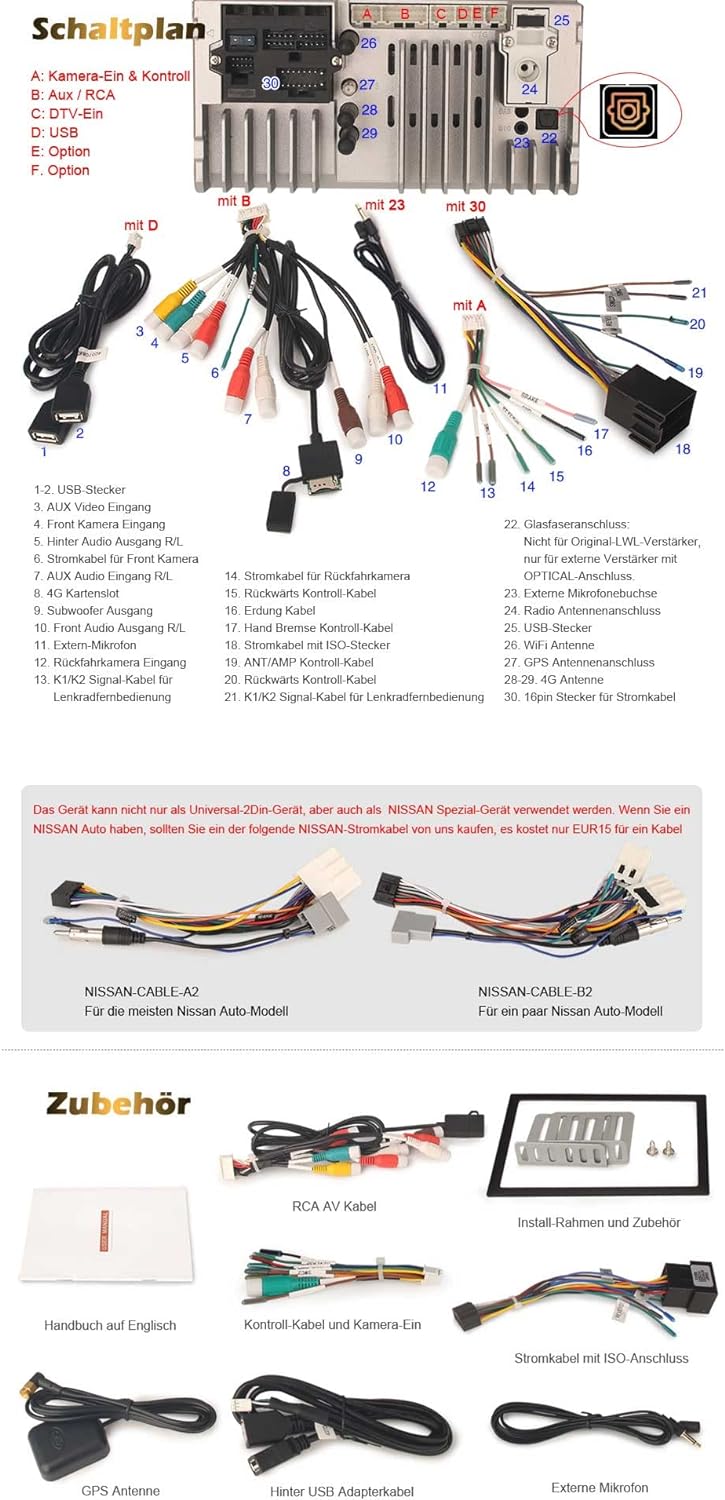 - 🚗【Android 11.0, 4GB RAM + 64GB ROM】 Universelles 7 Zoll Doppel DIN Autoradio mit Navi, passt auch für Nissan Autos. CPU: 8-Kern Cortex A53 PX5 1512 MHz. Betriebssystem: Android 11.0, RAM: 4GB, ROM: 64GB, unterstützt 2 TF-Karten / 4 USB bis zu 6 * 128 GB erweiterten Speicher. Kapazitiver HD-Touchscreen mit einer Auflösung von 1024 * 600. Audio-Ausgangsleistung: 4 * 45 W. Die Einbaugrösse des Autoradios beträgt 2 Din Grösse, 180 mm * 100 mm * 45 mm.