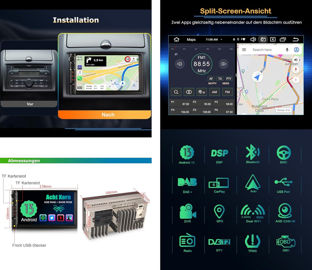 - 🚗【Wireless CarPlay & Wired Android Auto & DSP】 Verbinden Sie einfach Ihr iPhone mit diesem Radio über Bluetooth, Ihr Android-Smartphone über USB mit diesem Radio, dann können Sie ganz einfach telefonieren, Voicemails abrufen, Textnachrichten senden und empfangen, Musik hören und vieles mehr Verwenden Sie die Online-Navigation, damit Sie sich auf die Strasse konzentrieren können. Intelligenter und sicherer! Eingebauter DSP-Verstärker, der den perfekten Soundeffekt in Ihr Auto bringt.