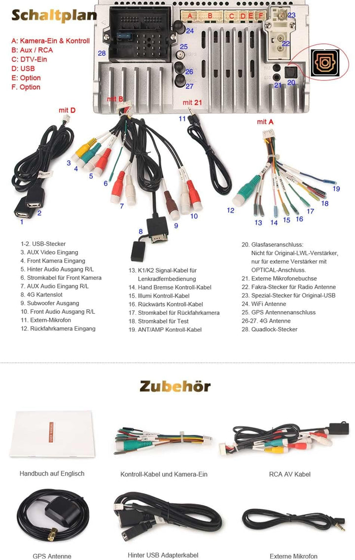 - đăLeistungsstĂ€rkere FunktionenăIntegriertes Android Multimedia Player, es kann Musik/Video/Foto aus interne Speicher oder externe USB-Stick abspielen. Eingebauter USB, TF, Radio, RDS, Uhr. UnterstĂŒtzt DAB+, DVB-T2, TPMS, OBD2, DVR, Kamera, Video