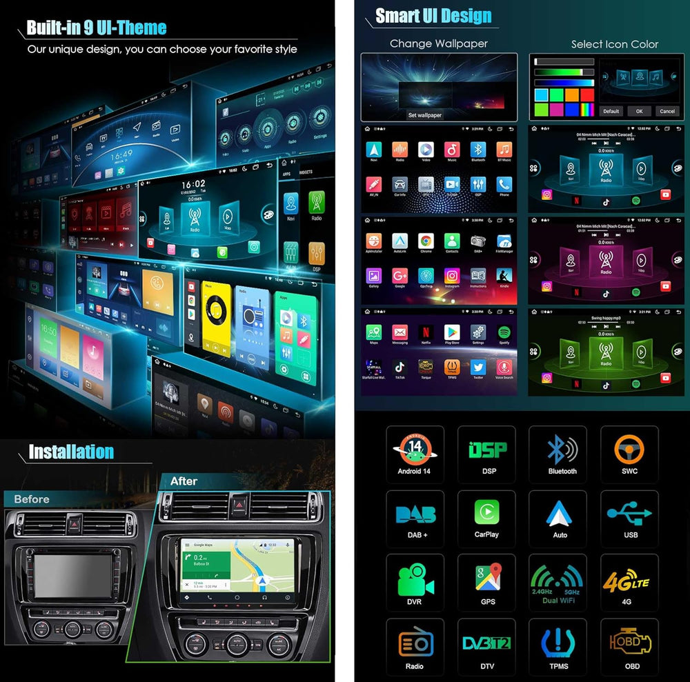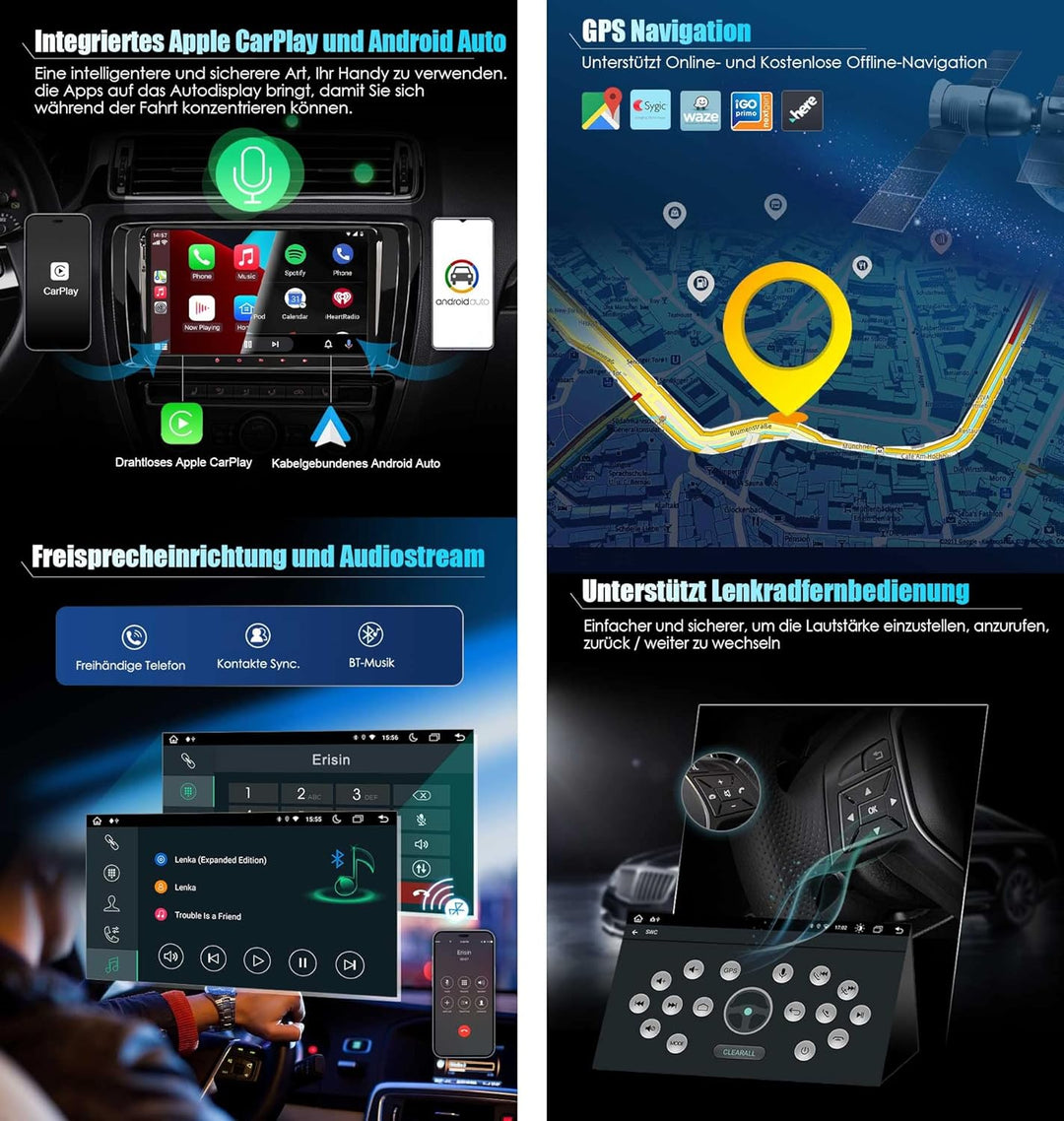 - đăWireless CarPlay / Android-Auto + DSP-VerstĂ€rkerăSchliessen Sie einfach ein iPhone (ĂŒber BT) oder ein Android-Smartphone (ĂŒber BT/USB) an dieses Radio an und Sie können Ihr Handy ganz einfach ĂŒber diese Stereoanlage steuern, was das Fahren