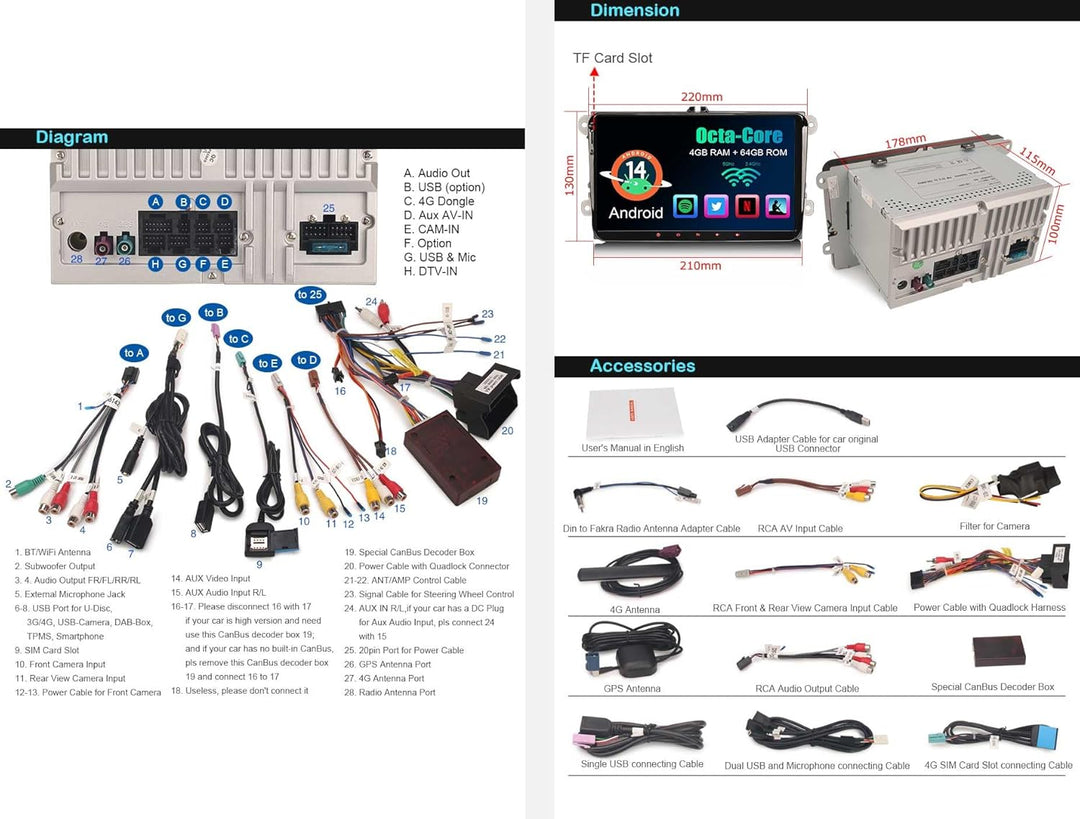 - đăLeistungsfĂ€higere FunktionenăIntegriertes Android Multimedia Player, es kann Musik/Video/Foto aus interne Speicher oder externe USB/Karte abspielen. Integrierte USB, TF, AM / FM Radio, RDS, Uhr, Kalender, Chrome. UnterstĂŒtzt DAB+, DVB-T/T2,