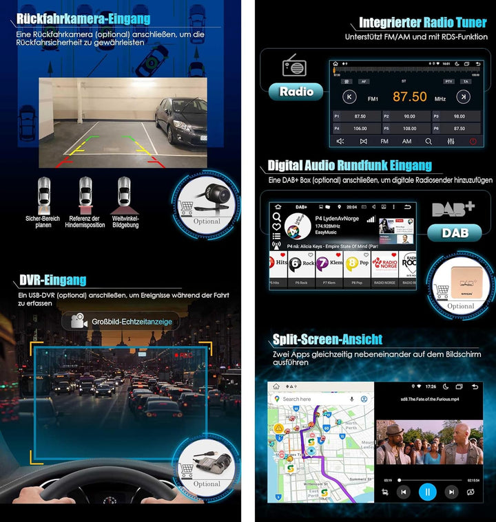 - đăGPS Navigation & BluetoothăEingebauter GPS EmpfĂ€nger, wir stellen Ihnen eine kostenlose Offline-Karte und eine GPS Antenne zur VerfĂŒgung. Sie können auch die Online-Karte/Navigation ĂŒber das verbundene Internet verwenden. ZusĂ€tzlich können