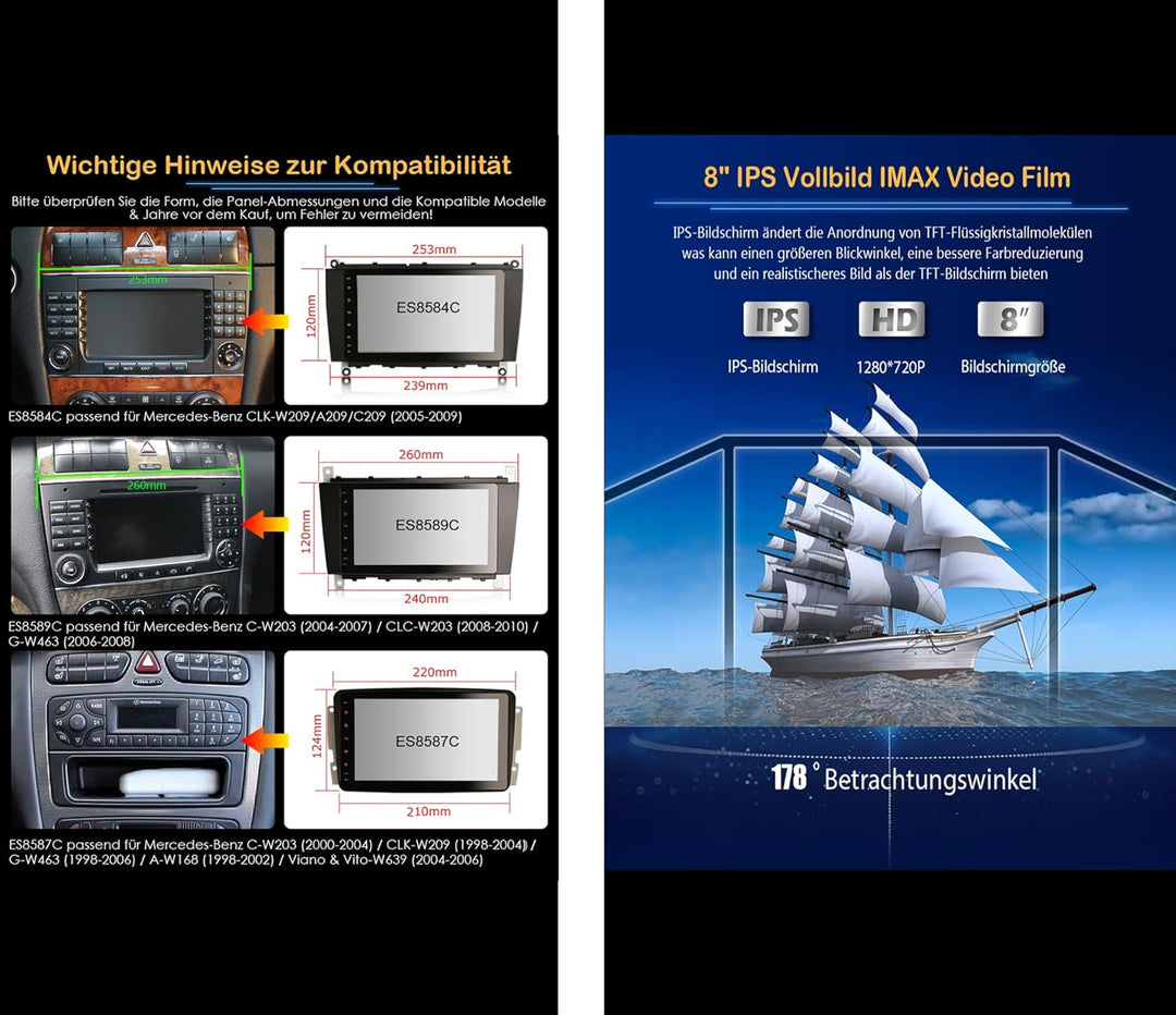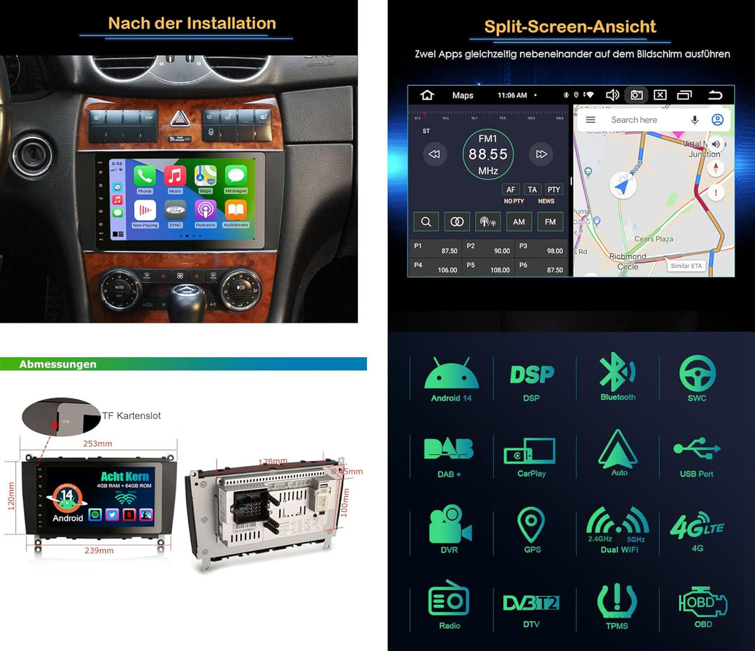 - ✪【Kompatibilität】für Mercedes Benz CLK-Class W209/C209/A209 2005-2009. Die Frontplattengrösse beträgt 253mm (obere Breite) * 120mm (hoch) * 239mm (untere Breite). Bitte überprüfen Sie vor dem Kauf Ihre Armaturenbrettgrösse, um Fehler zu