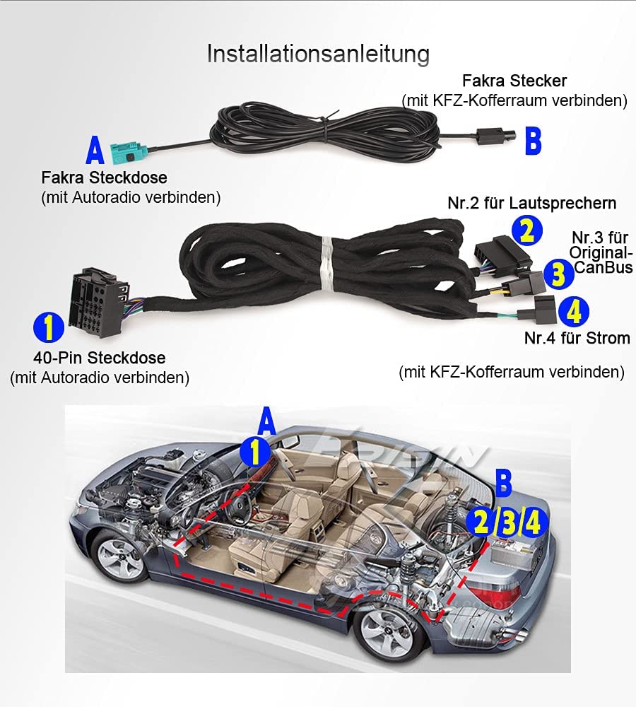 • Wenn Ihr Auto über ein Glasfaser-Verstärker/Soundsystem wie Harman-Kardon oder Bose verfügt, können Sie dieses BZ6M-Verlängerungskabel kaufen, um das Soundsystem zu umgehen und den Ton direkt über Ihre Autolautsprecher auszugeben.