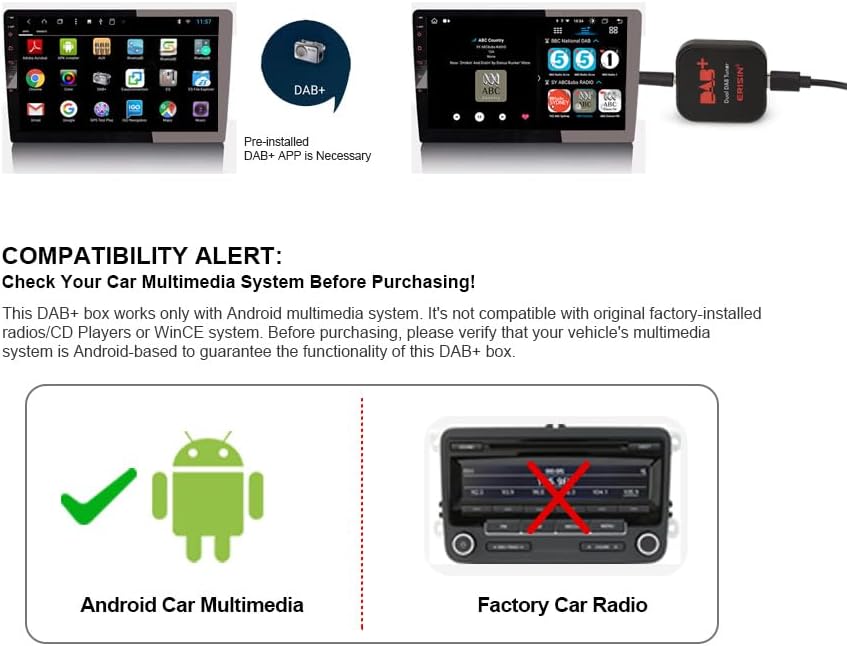 - ✪ Erisin DAB+ BOX Digitalradio ermöglicht es Ihnen, überregionale Musik mit Ihren lokalen und neuen Kanälen zu geniessen. Der Klang in der Audio-CD nahe kommender Qualität und die rauschfreie Übertragung machen das DAB-Radio zu einem besonderen Erlebnis im Fahrzeug. Du kannst ihn nicht verpassen.