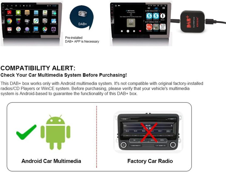 - ✪Mit dieser DAB+ Box können Sie von nun an die überlegene Audioqualität von DAB+ in Ihrem Auto geniessen.Die mitgelieferte Antenne selbst ist mit verstärkter Funktion, hoher Empfindlichkeit ausgestattet