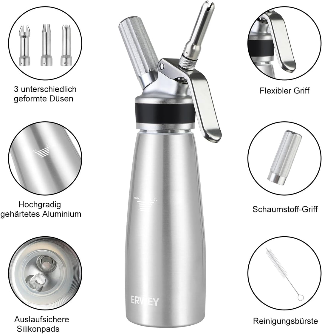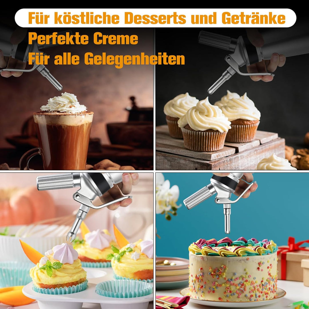 - Professioneller Sahneschläger: Dieser Sahnesyphon besteht aus aluminium für ein einfaches, robustes Design. Im Lieferumfang enthalten: 1 x Sahneaufschlaggerät, 3 x Dekorationsspitzen, 1 x Reinigungsbürste, 1 x Gasverschlusshahn (aus pp). Eine gute