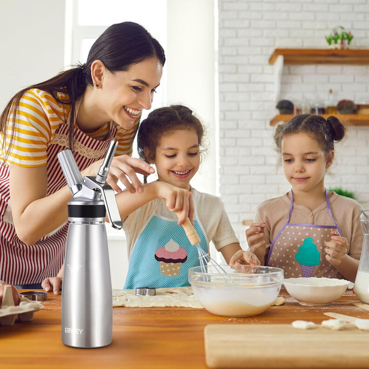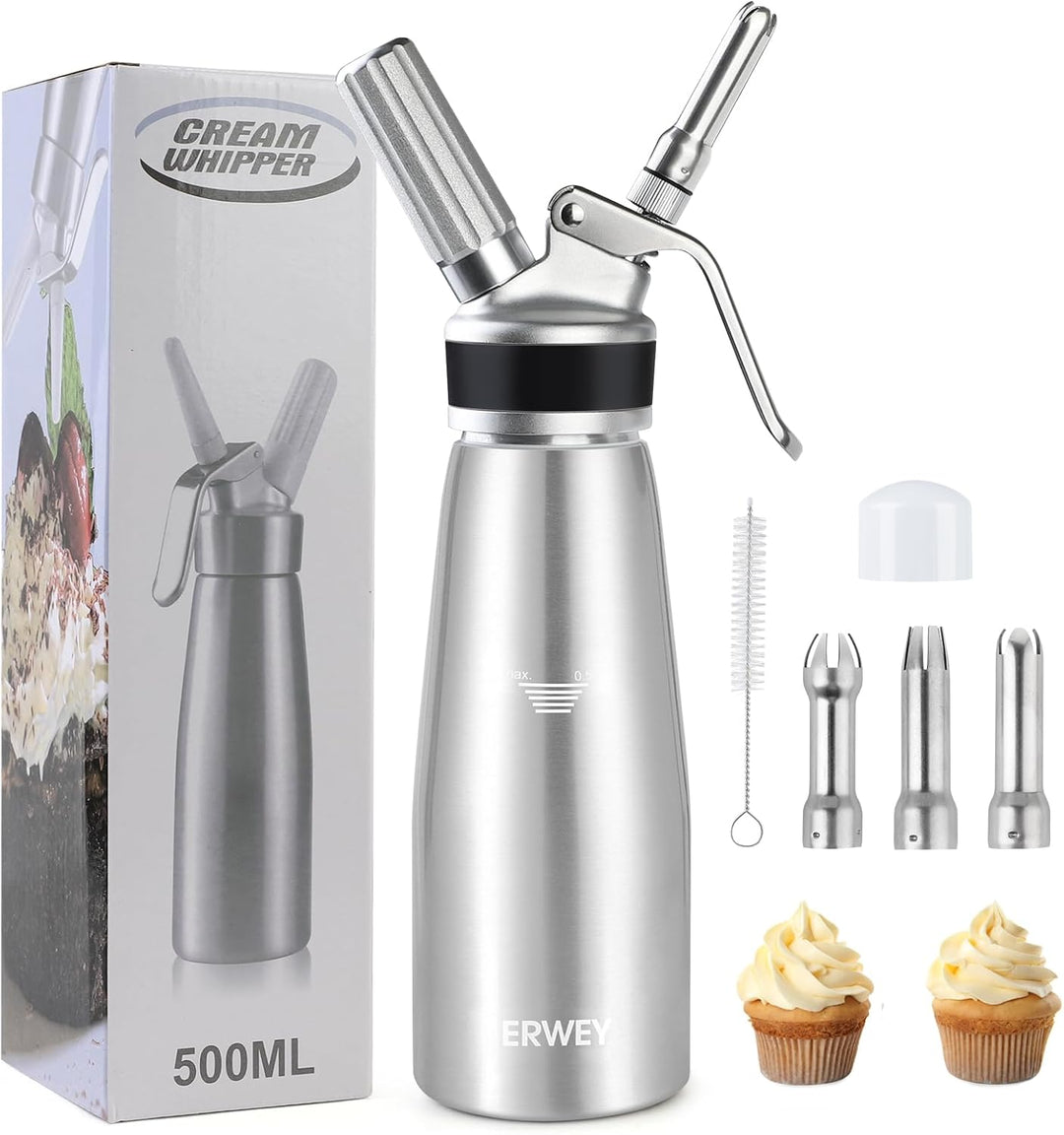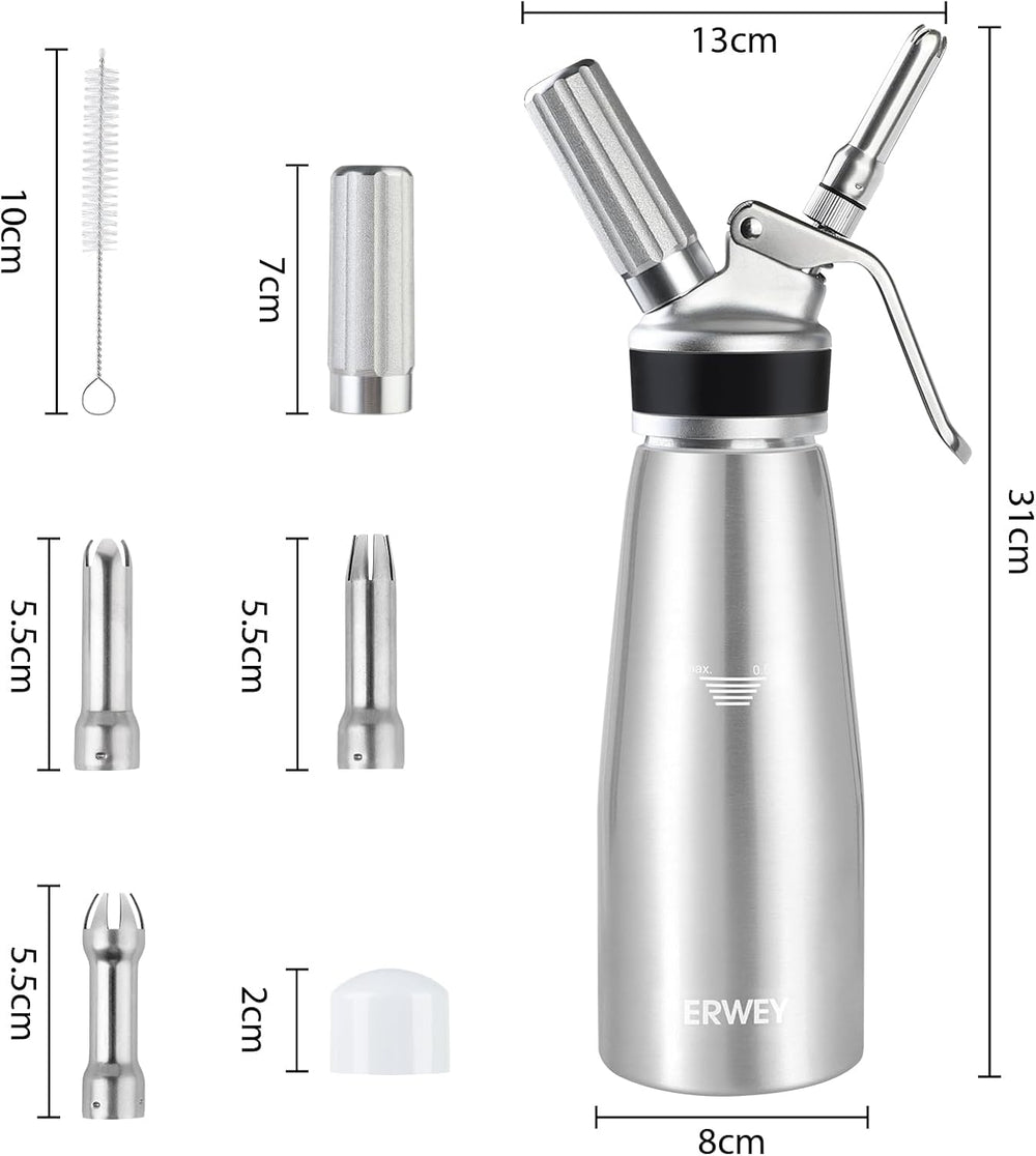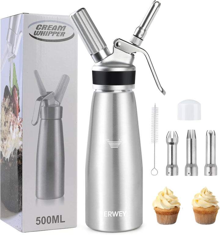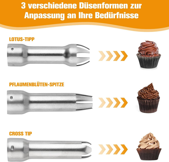 - 3 Dekorationsdüsen: Dieser 500ml-Sahnespender wird mit 3 verschiedenen Dekorationsdüsen geliefert: Kreuz, Lotus und Pflaumenblüte, eignet sich hervorragend für Mousse, Geburtstagskuchen, Eiscreme, Konditorei-Sahne, Shakes, Schneedecke,