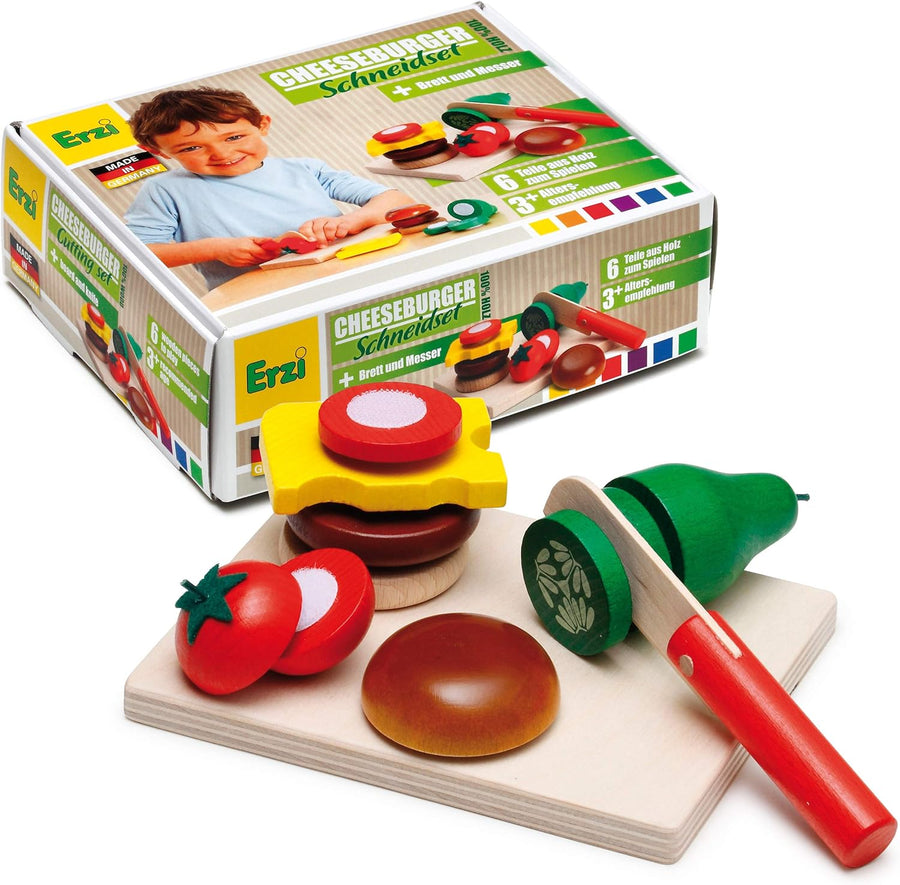Erzi 28203 Schneidset Cheeseburger aus Holz, Kaufladenartikel für Kinder, Rollenspiele