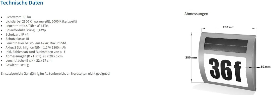 - Lieferung incl. Akku und Zahlensatz, max. 3-stellige Hausnummer