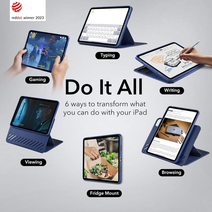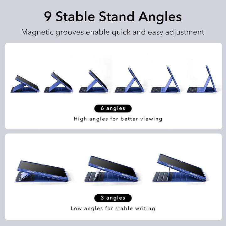 - Ultrastabiler Ständer: Breite Stützhalterungen rasten magnetisch in Rillen in der Basis ein, um dir hervorragende Stabilität zu bieten, selbst wenn du dein iPad Pro auf deinem Schoss verwendest