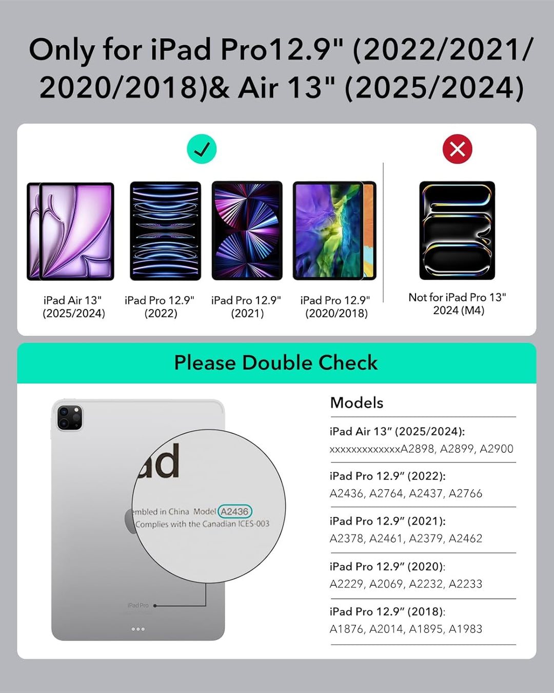 - Kompatibilität: Nur kompatibel mit iPad Pro 12,9 Zoll (6. Generation, 2022), iPad Pro 12,9 Zoll (5. Generation, 2021), iPad Pro 12,9 Zoll (4. Generation, 2020) und iPad Pro 12,9 Zoll (3. Generation, 2018); Modelle A2436, A2764, A2437, A2766, A2378,