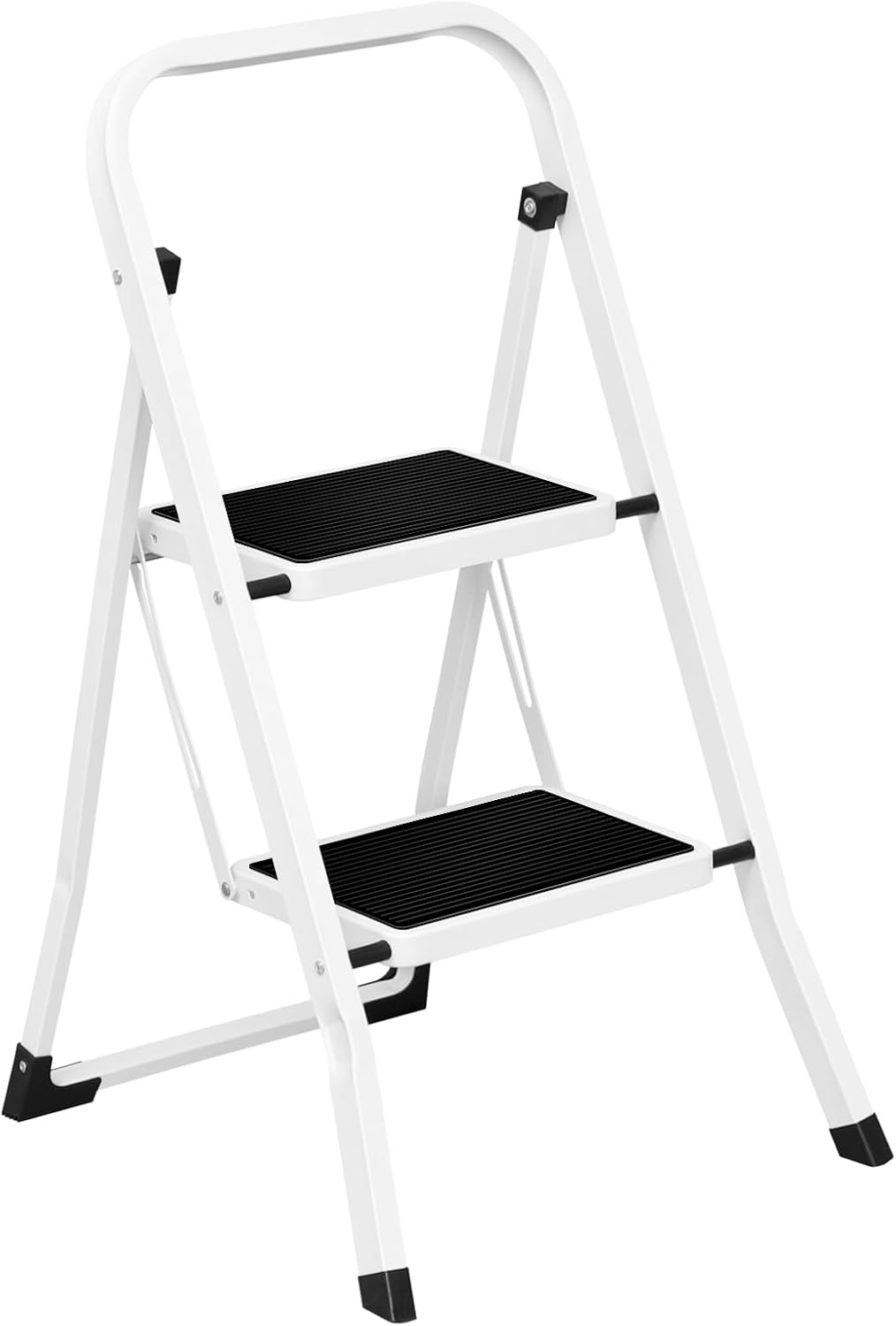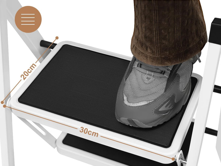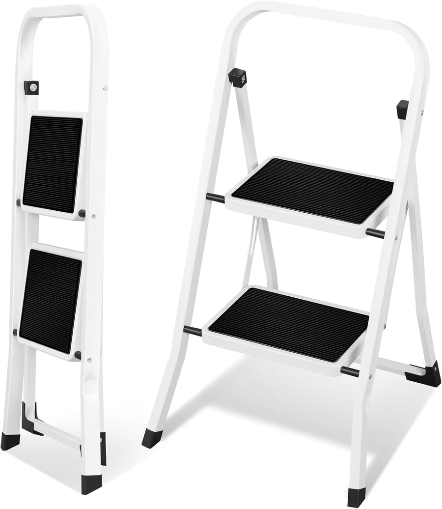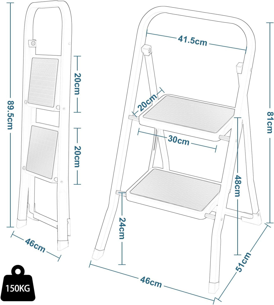 - Platzsparendes Klappdesign: Die Leiter mit 2 Stufen ist auf 4,5 cm Dicke klappbar und kann hinter Türen, Schränken oder in Nischen zwischen Schränken und Wänden verstaut werden. Die kompakte Klappgrösse erleichtert auch das Tragen und den Transport