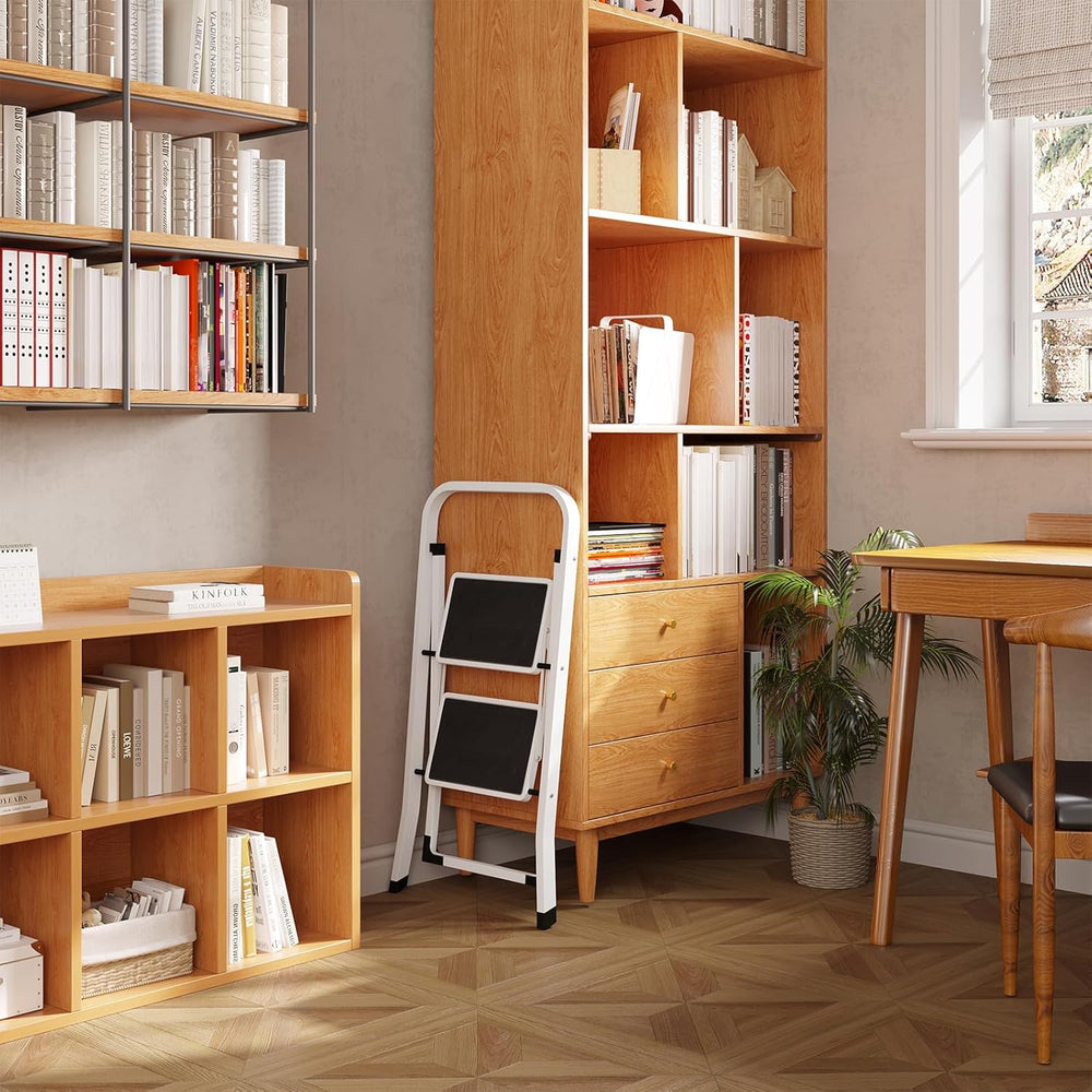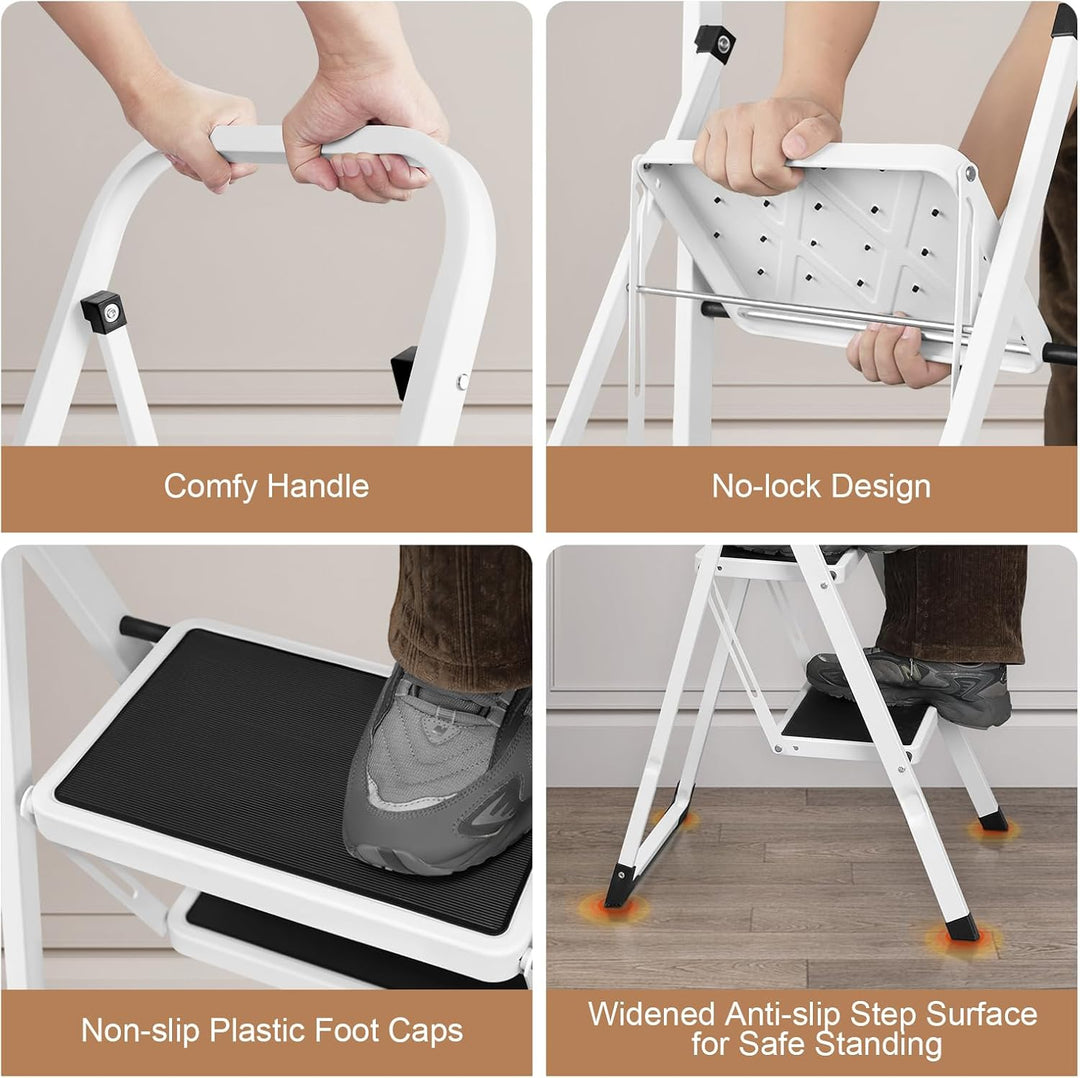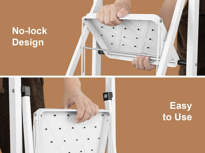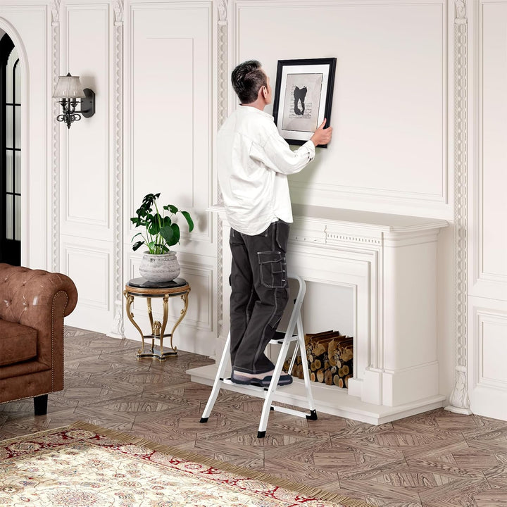 - Platzsparendes Klappdesign: Die Leiter mit 2 Stufen ist auf 4,5 cm Dicke klappbar und kann hinter Türen, Schränken oder in Nischen zwischen Schränken und Wänden verstaut werden. Die kompakte Klappgrösse erleichtert auch das Tragen und den Transport