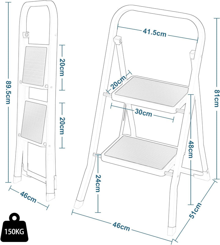 - Robust & Stabil: Aus beschichtetem legiertem Stahl ist die Trittleiter mit 2 Stufen robust, rostfrei und langlebig. Hochwertig verarbeitet weist sie keine scharfen Kanten auf. Ausgeklappt hat sie eine stabile Dreieckstruktur und kann 150 kg tragen