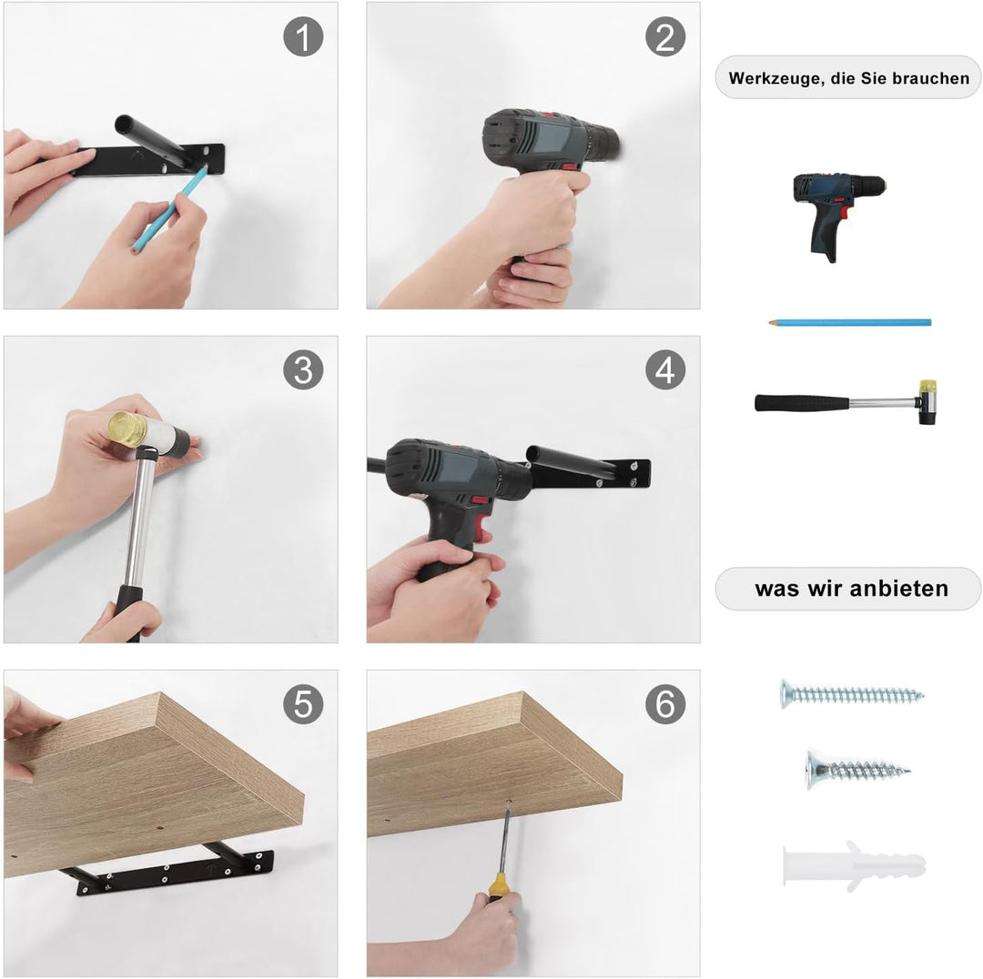 - Lieferumfang: 4 x Wandregale, Eisenrahmen, Schrauben und Anleitung.