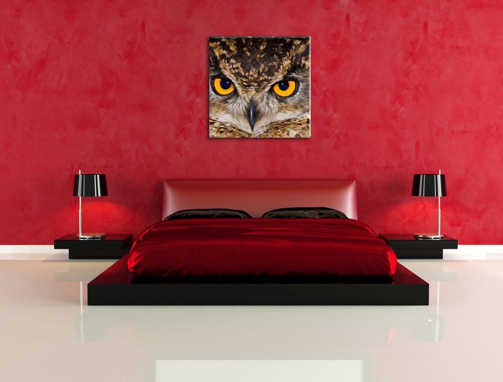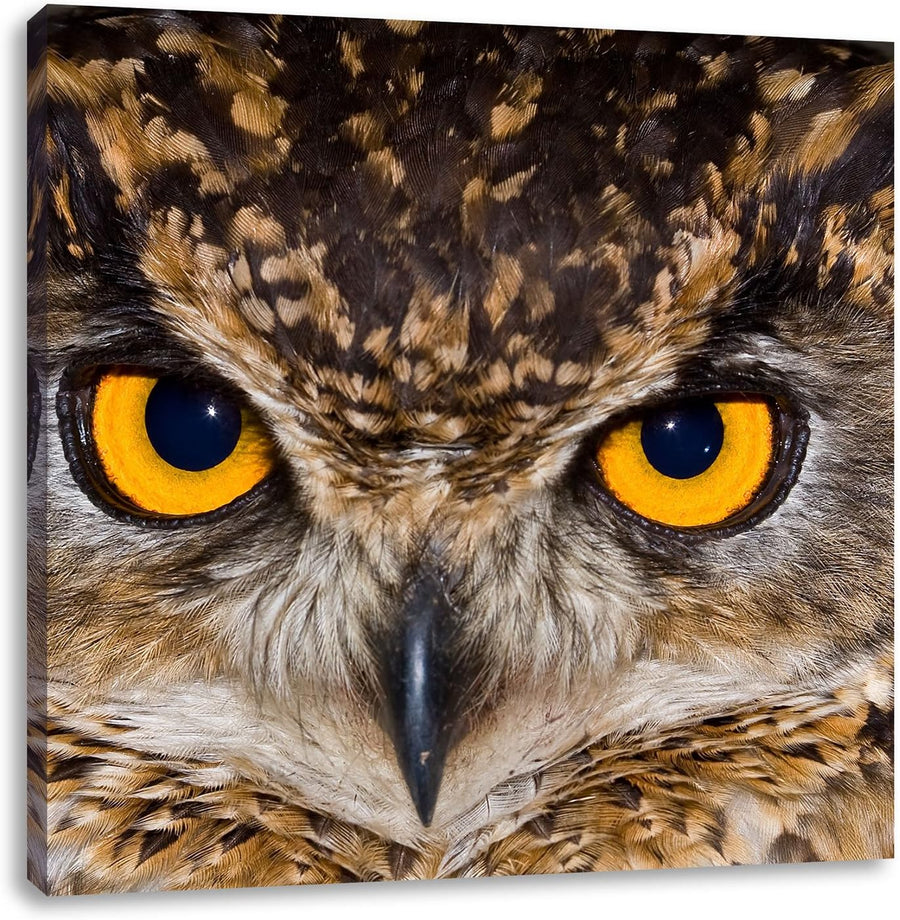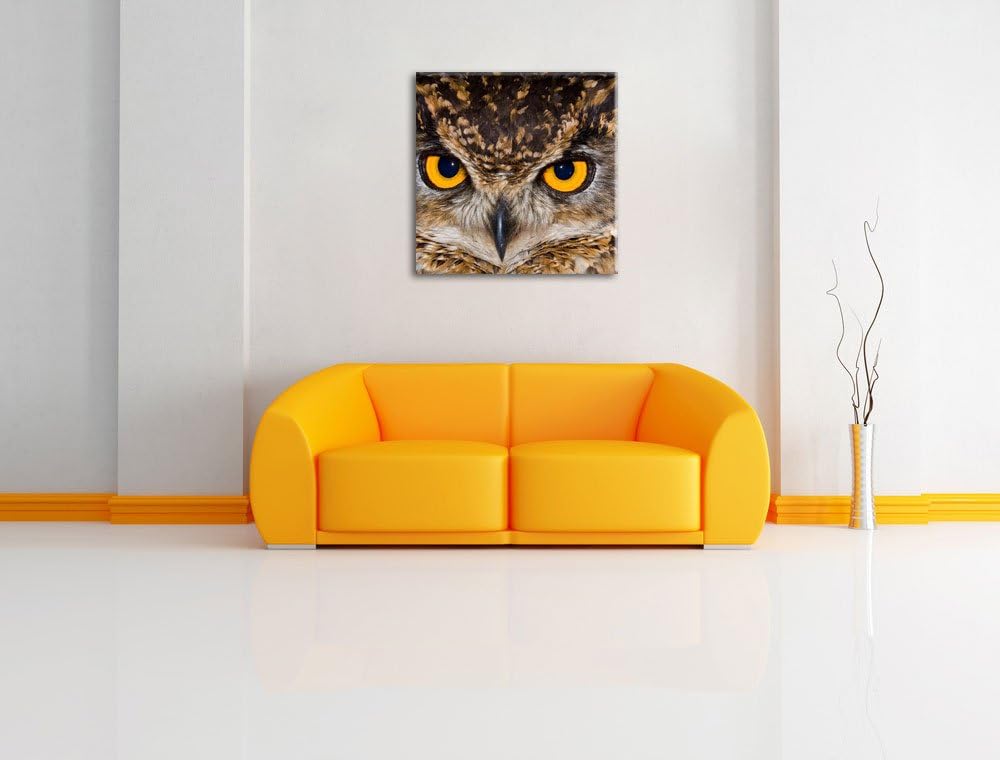 Eule mit gelben Augen, Format: 70x70 auf Leinwand, XXL riesige Bilder fertig gerahmt mit Keilrahmen,