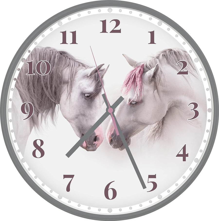 - đ´ăSCHĂNES DESIGNăDie Quarzwanduhr mit Ross und Rosie glänzt mit ihrem harmonischen Zusammenspiel von Motiv und Gehäuse. Das klare 12-Zahlen-Zifferblatt liegt optimal um das sĂźsse Pferdemotiv und verwandeln die Uhr in ein Must-have fĂźr den